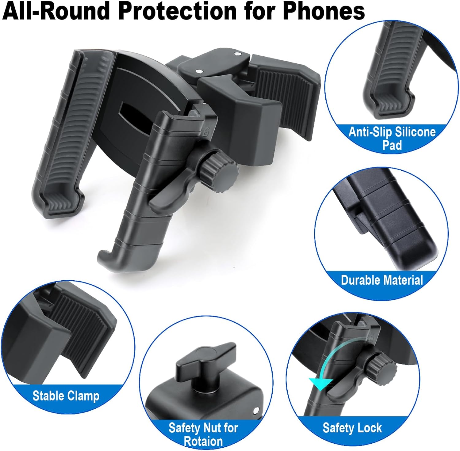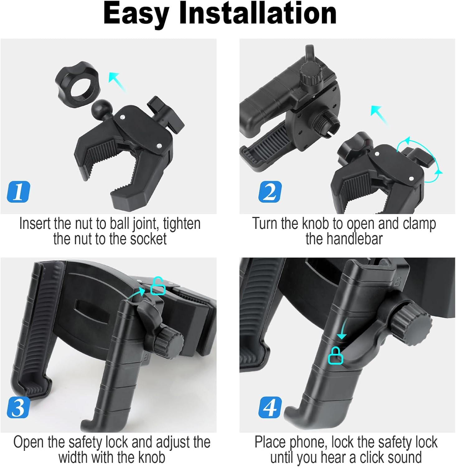 - 【TOOL FREE INSTALLATION】No tools are required for the easy and quick installation of the innovative clamp. Simply connect ball joint, clamp the mount on the frame, adjust width of the stand, place your phones and lock it.