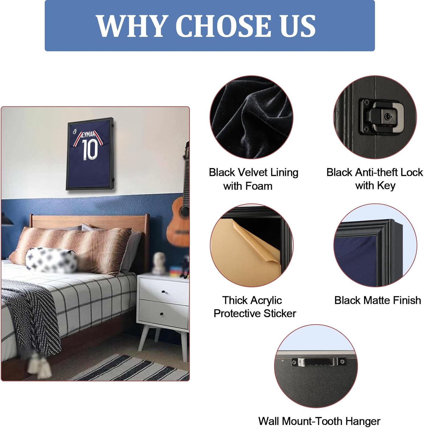 - PREMIUM QUALITY AND RELIABLE FEATURES - Crafted with high-quality wood and a durable anti-fade matte black finish, IHEIPYE Kids Jersey Frame offers long-lasting use. Its shatter-proof acrylic glass panel provides 92% transparency and 98% UV protection, while the black velvet-like felt lining and two metal anti-theft locks ensure your cherished sports memorabilia is well-protected.