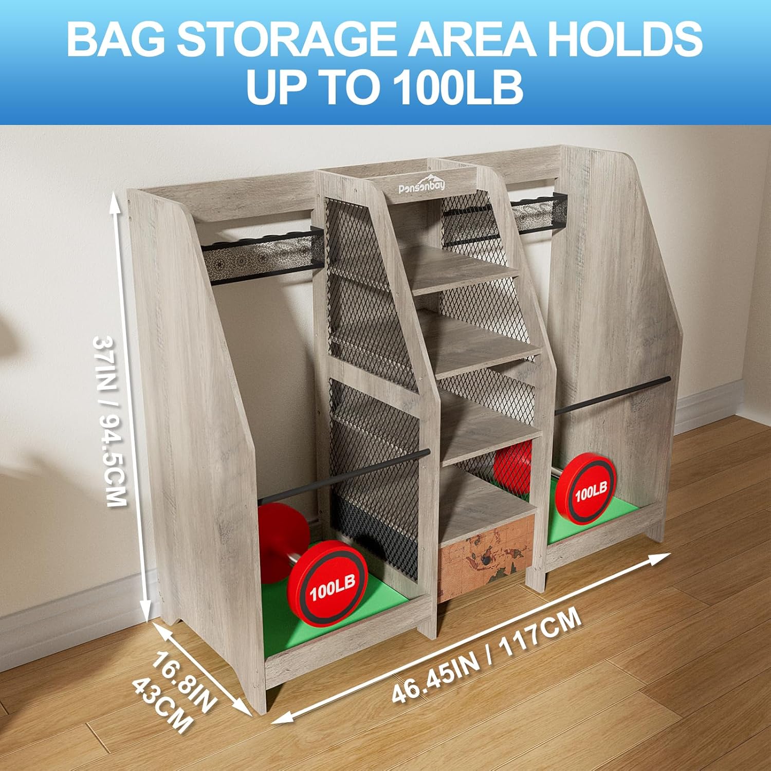 - High Storage Capacity:Ponsonbay golf bag storage rack is the most spacious rack on the Amazon market. It can hold 2 x golf bags, 12 x clubs, 4 x shoes, 50+ golf balls, many golf apparel, gloves, and hats