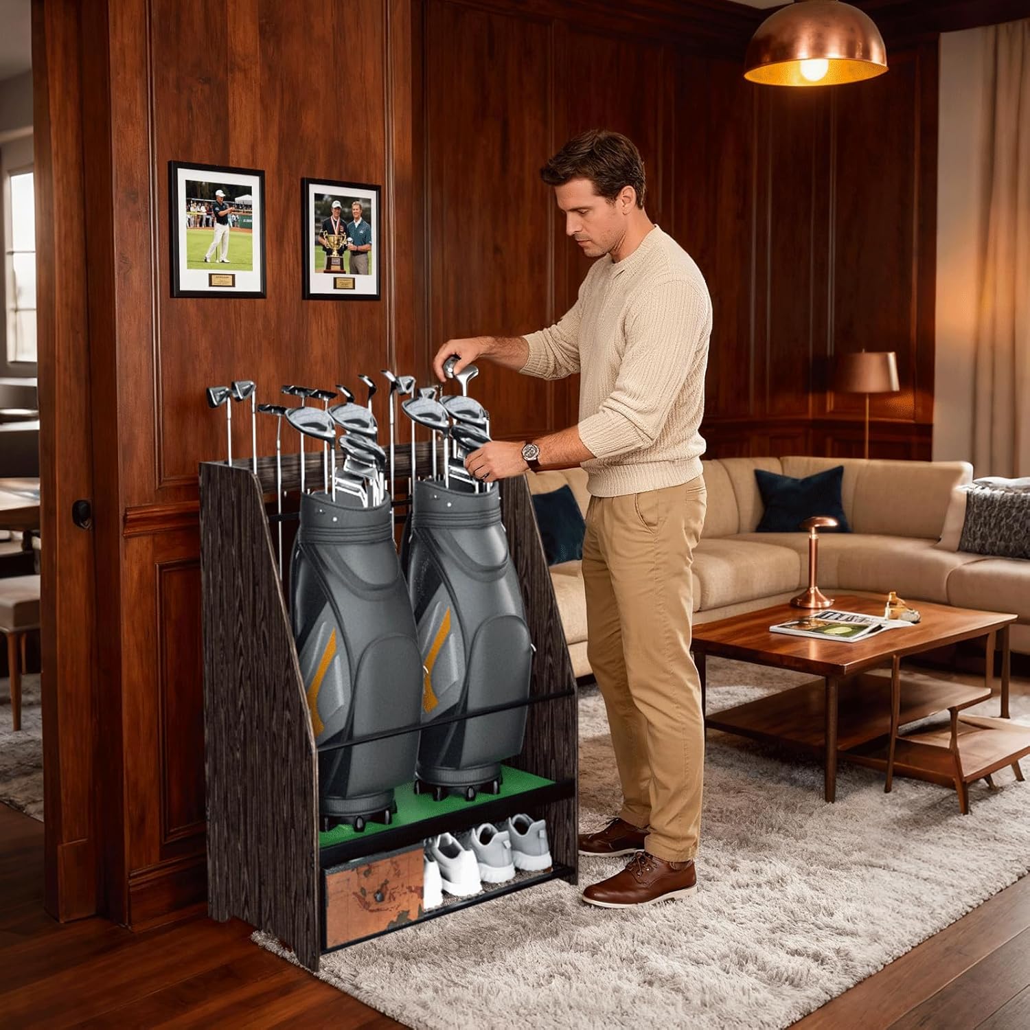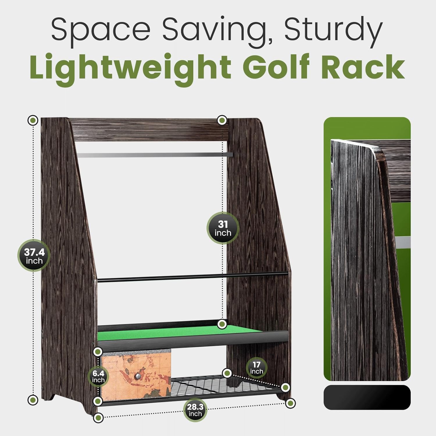 - Versatile Multi-Scene Use: Elegant wood grain finish complements garage, practice room, living room, office, gym, or golf club. Not only for golf gear but also for sports equipment like basketballs, badminton rackets, skateboards, yoga mats, and more.