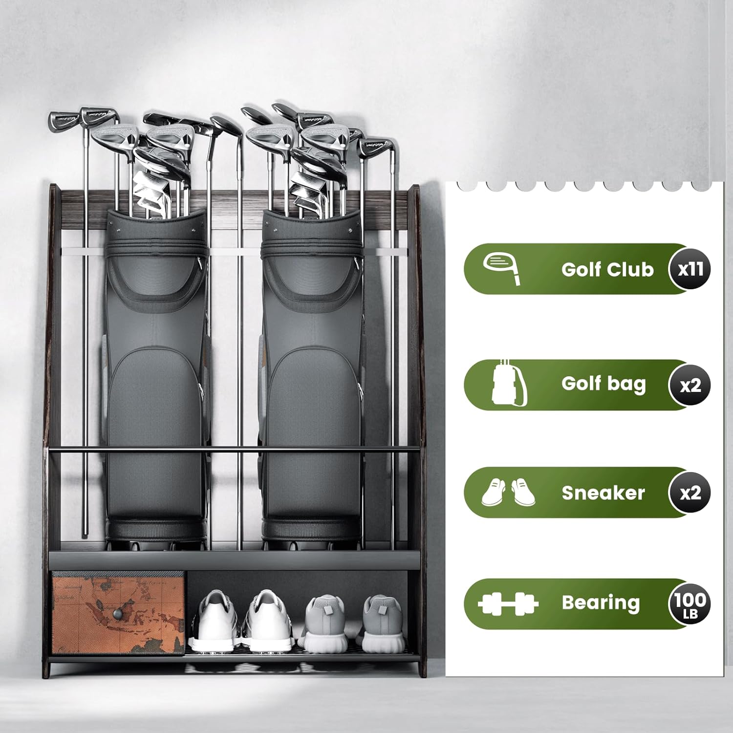 - Large Storage Capacity: This wooden golf bag organizer holds 2 golf bags, multiple clubs, 2 pairs of shoes, and essential accessories. A built-in 17×6.4in dustproof drawer stores clean clothes or hundreds of golf balls. Overall size: 28.35" L × 17.00" W × 37.40" H.