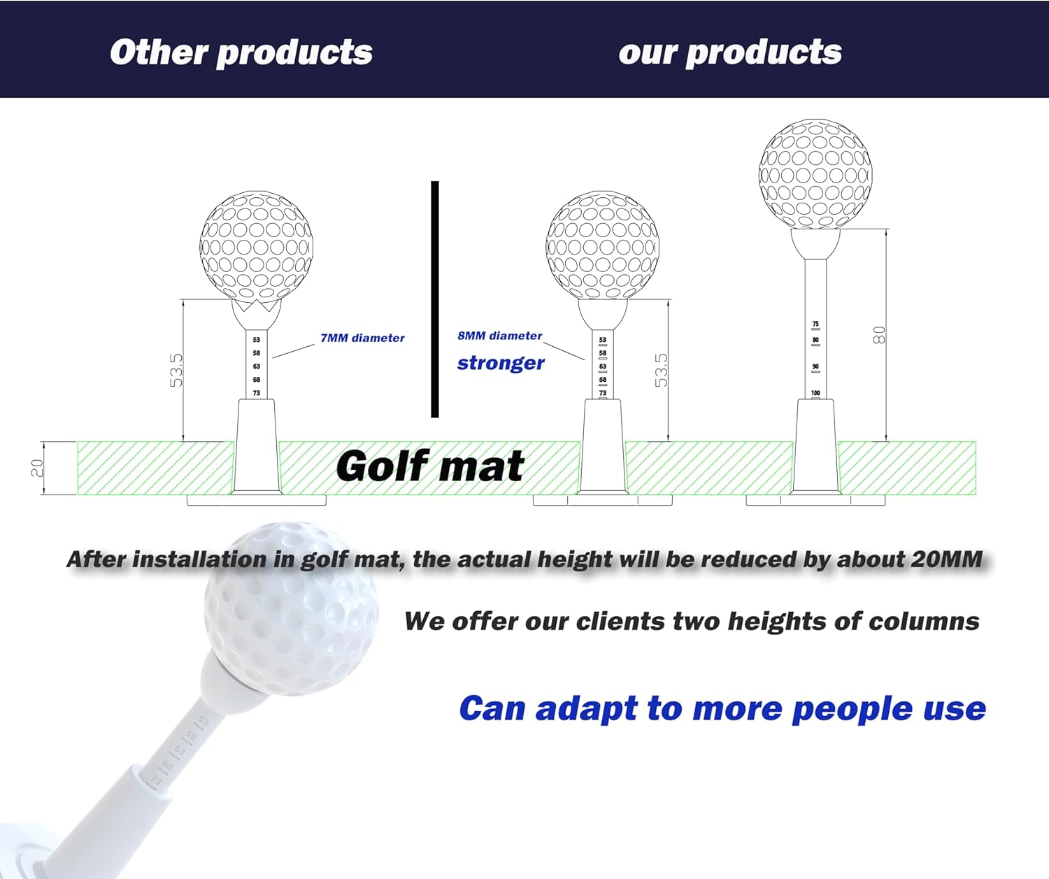 - 【Adjustable Height golf tee】Our adjustable golf tees are available in two extreme heights,One range is from 2.1-2.9 inches,Another range is from 2.95-3.94 inches.Our golf tees can accommodate more people and all thicknesses of golf mats on the market.Adjustable golf tee can solve the problem of fixed tee height adjustment.