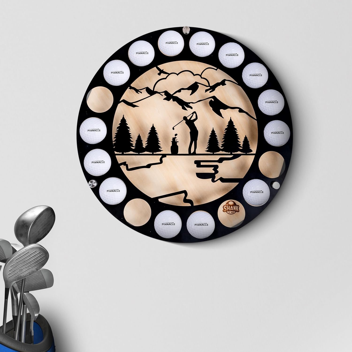 Circular Golf Ball Display Case for 18 Balls – Wall Mount Golf Ball Holder Display with Metal & Wood Design, Customized Wooden Backing, Easy Drill-Free Mounting – Gift for Golf Enthusiasts