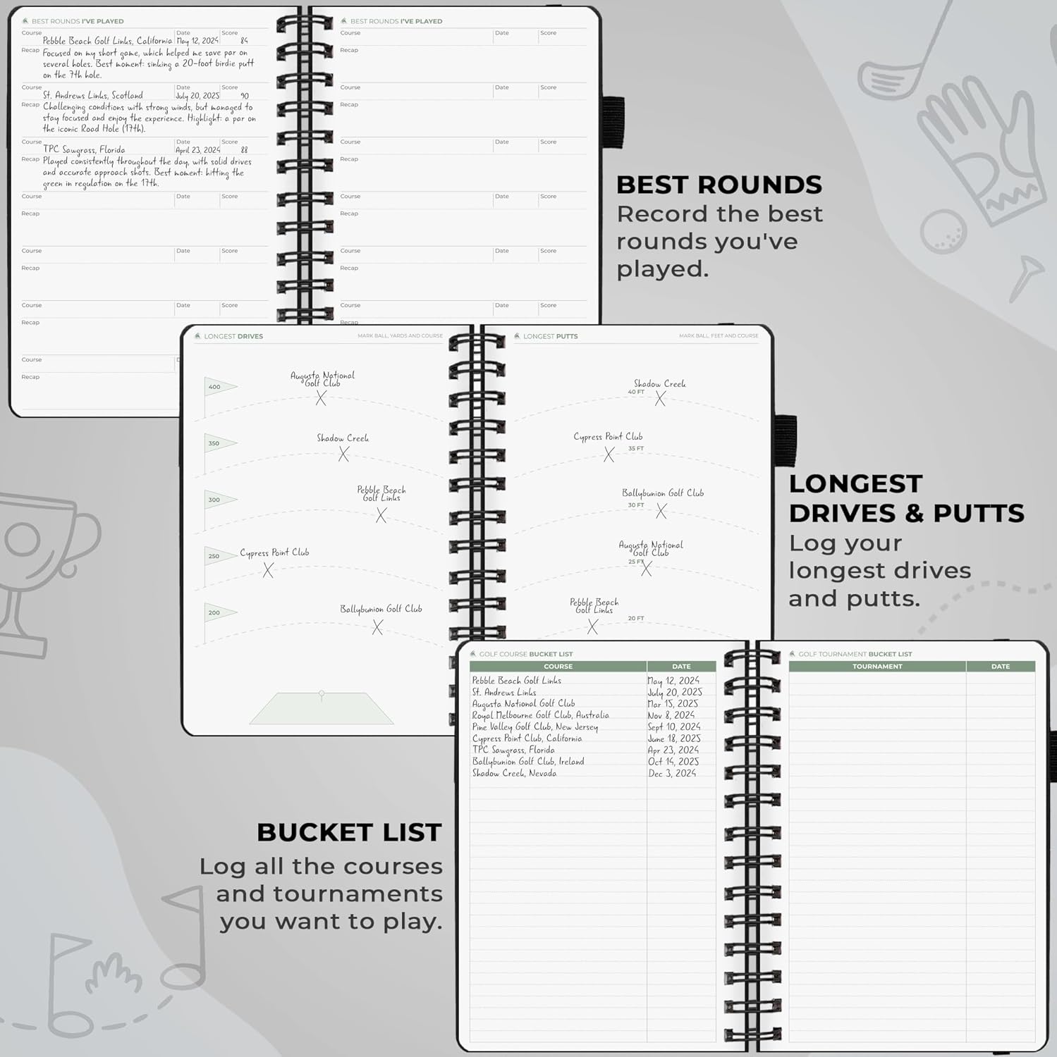 - TRACK GAME SCORES & PERSONAL BESTS – The golf journal & log book includes detailed scorecards to log game scores and totals, plus dedicated pages to record your best rounds, longest drives, top putts, and a bucket list of golf courses you want to play.