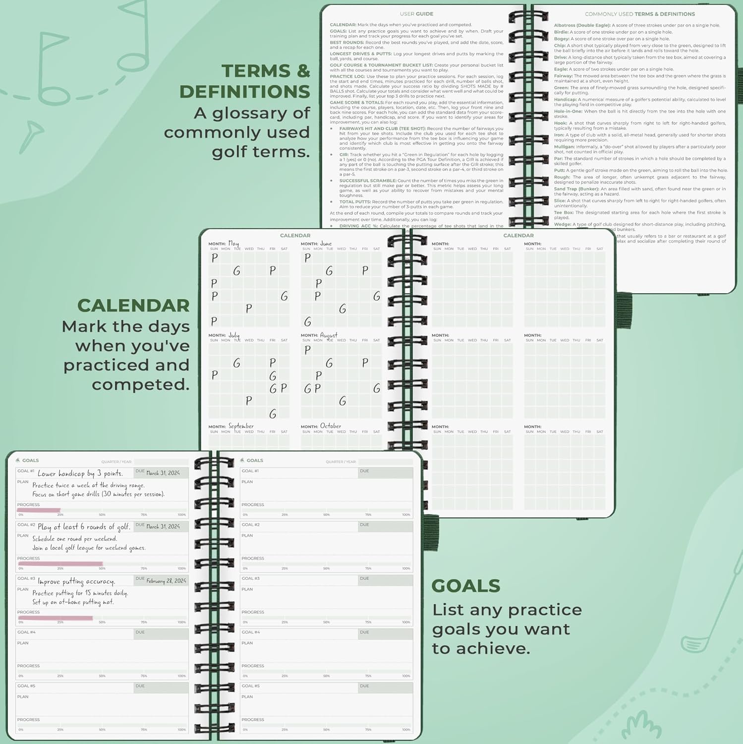 - AN ALL-IN-ONE GOLF LOG BOOK – This comprehensive golf log book is the perfect tool to plan your golf practice, track your performance, and work toward consistent improvement on your personal goals.