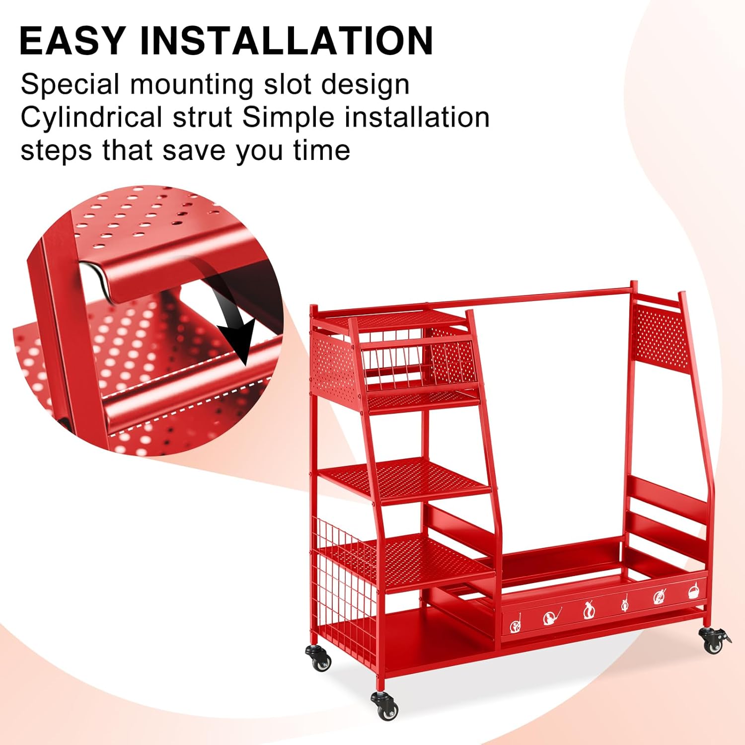 - Easy to Move & Stable When Stationary: The golf club storage stand with storage has 4 wheels that can rotate 360°, and you can push the garage storage stand to wherever you want. 2 of the 4 wheels can be locked, allowing flexible movement while maintaining sufficient stability in the placement position of the golf bag rack holder. The assembled freestanding garage storage station features 37.6'' L x 15.8'' W x 34.3'' H. Please measure where you want to put it before buying