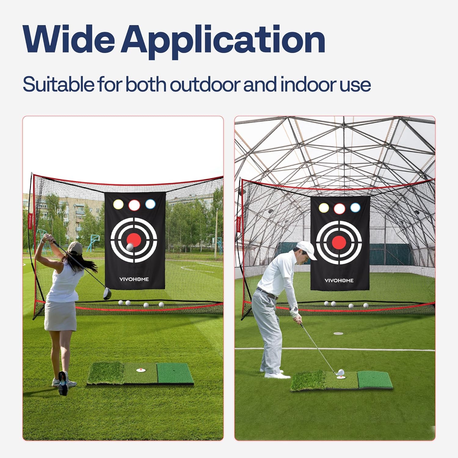 - GREAT FOR GOLF PRACTICE: This VIVOHOME golf practice net is designed to be a professional golf training aid, allowing you to enjoy the golf training fun anywhere; It comes with a black target cloth, with a large multi-circle target and 3 higher small targets; It can help you to maintain the muscle memory of the swing and improve strength and accuracy of chipping, driving, swings; It is equipped with 3 kinds of turf grass pads, 6 PU golf balls,7 golf tee, and 1 rubber holder