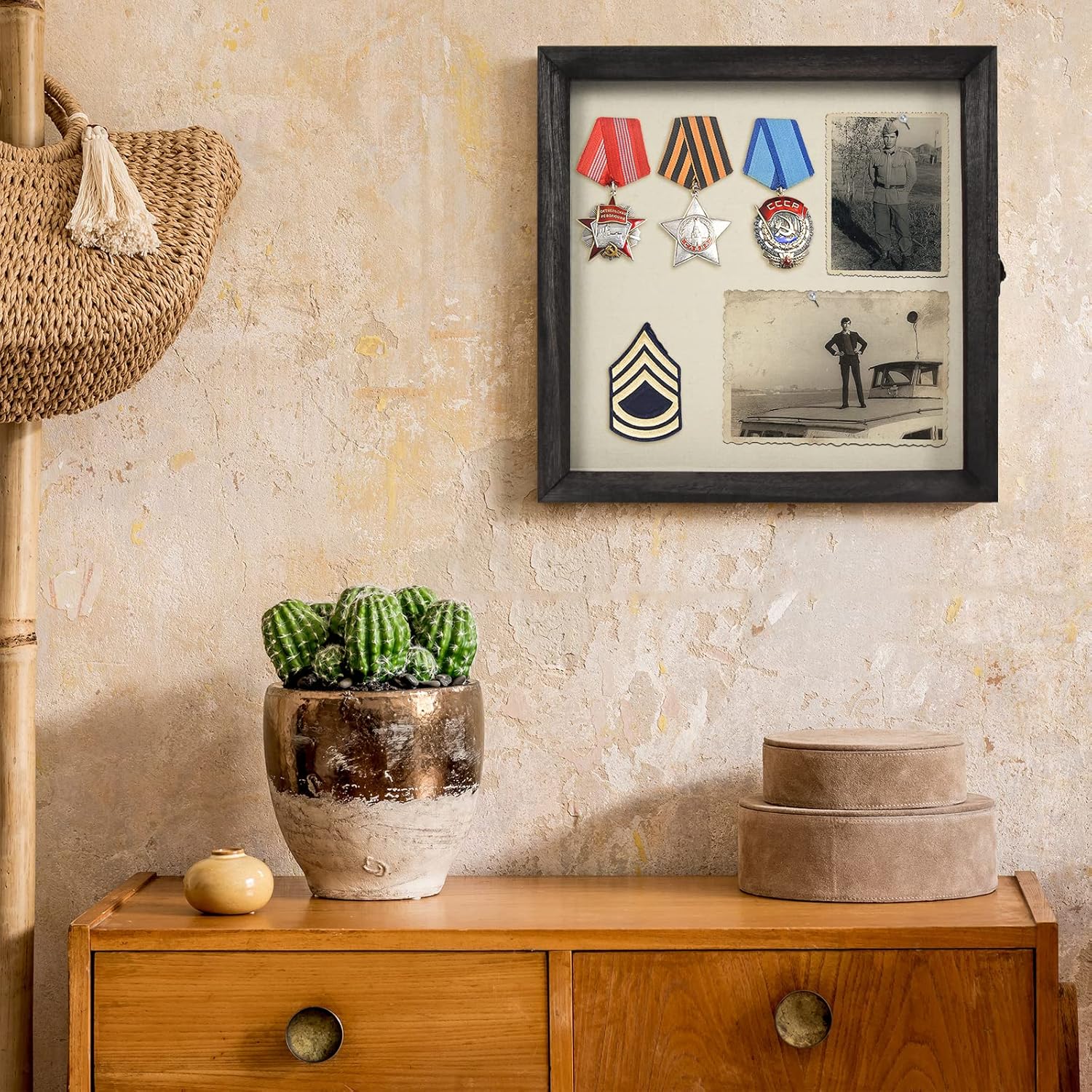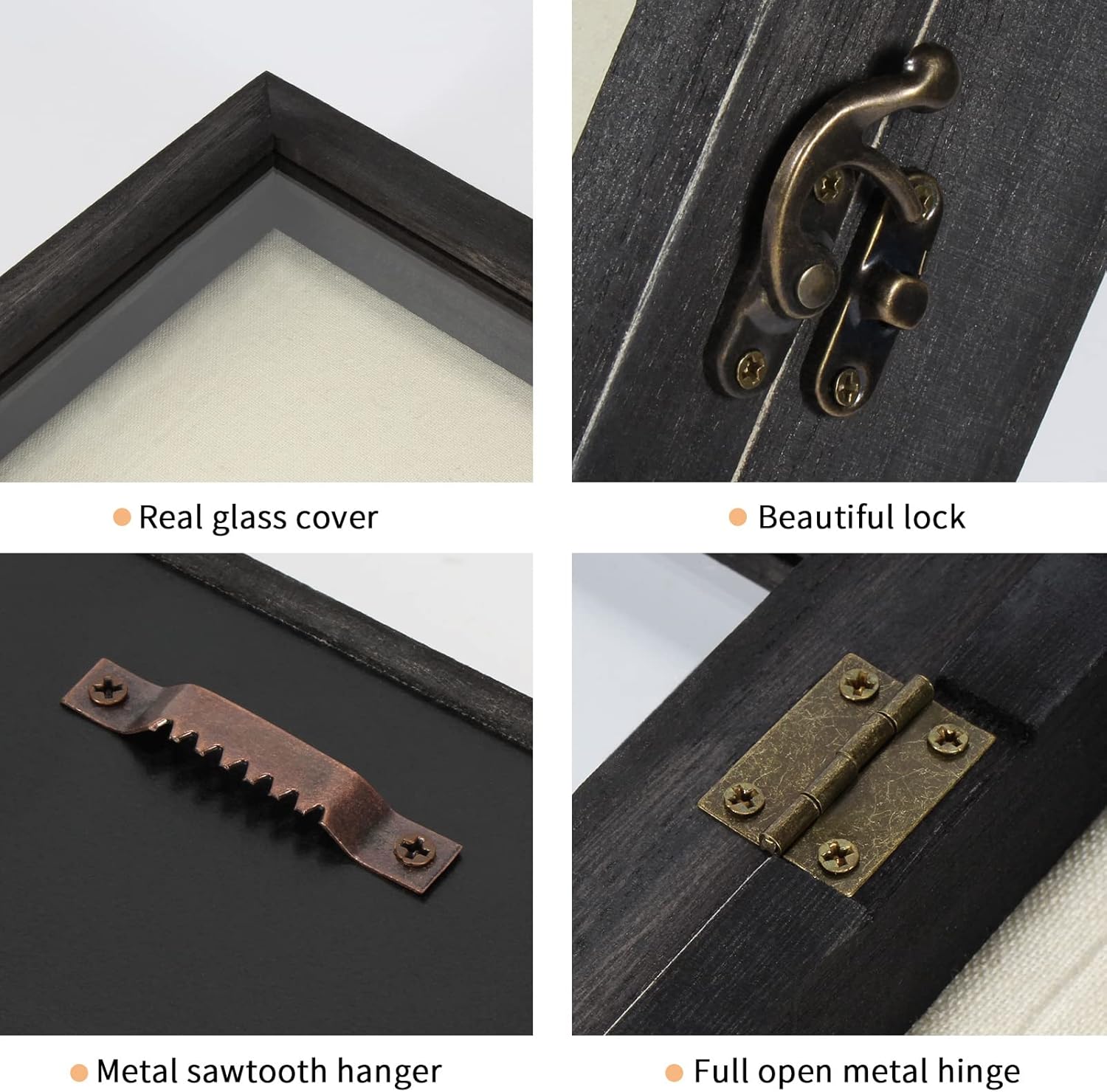 - High-Quality Materials – The shadow box inside dimension is 10.6'' x 10.6'' x 1.18'' (depth) and the outside is 12” x 12”, comes with a solid, durable wood frame, woven fabric interior with 4 stick pins, hasp horn lock door with a transparent shatterproof glass window, and two metal sawtooth hanging hooks on its back.
