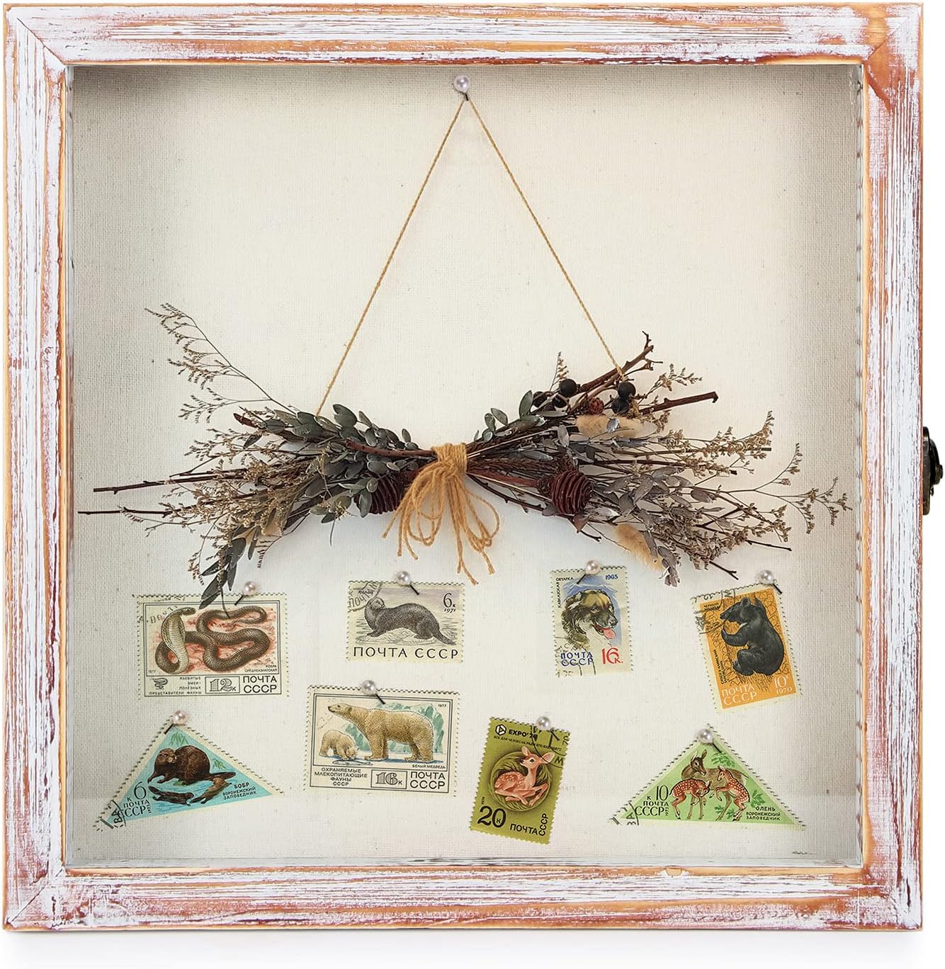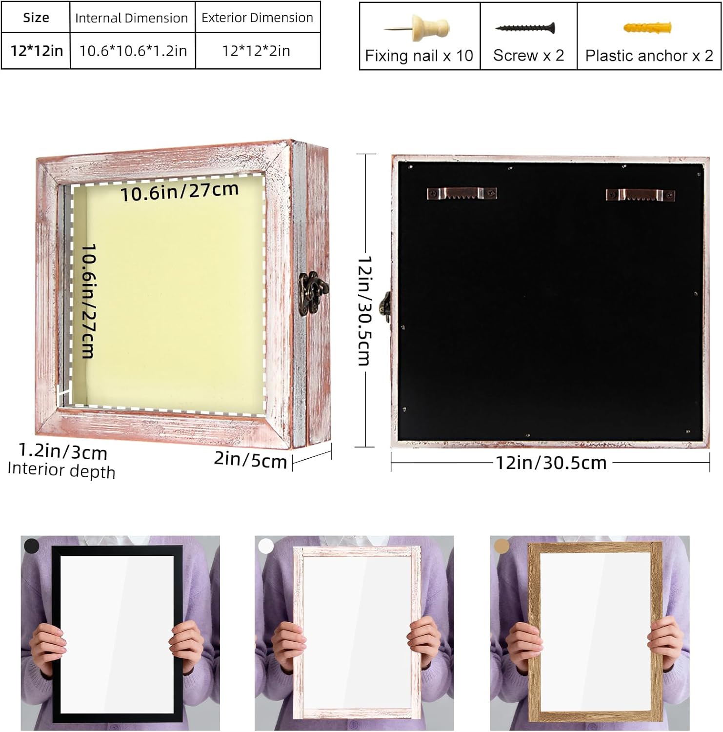 - High-Quality Materials – The shadow box inside dimension is 10.6'' x 10.6'' x 1.18'' (depth) and the outside is 12” x 12”, comes with a solid, durable wood frame, woven fabric interior with 4 stick pins, hasp horn lock door with a transparent shatterproof glass window, and two metal sawtooth hanging hooks on its back.