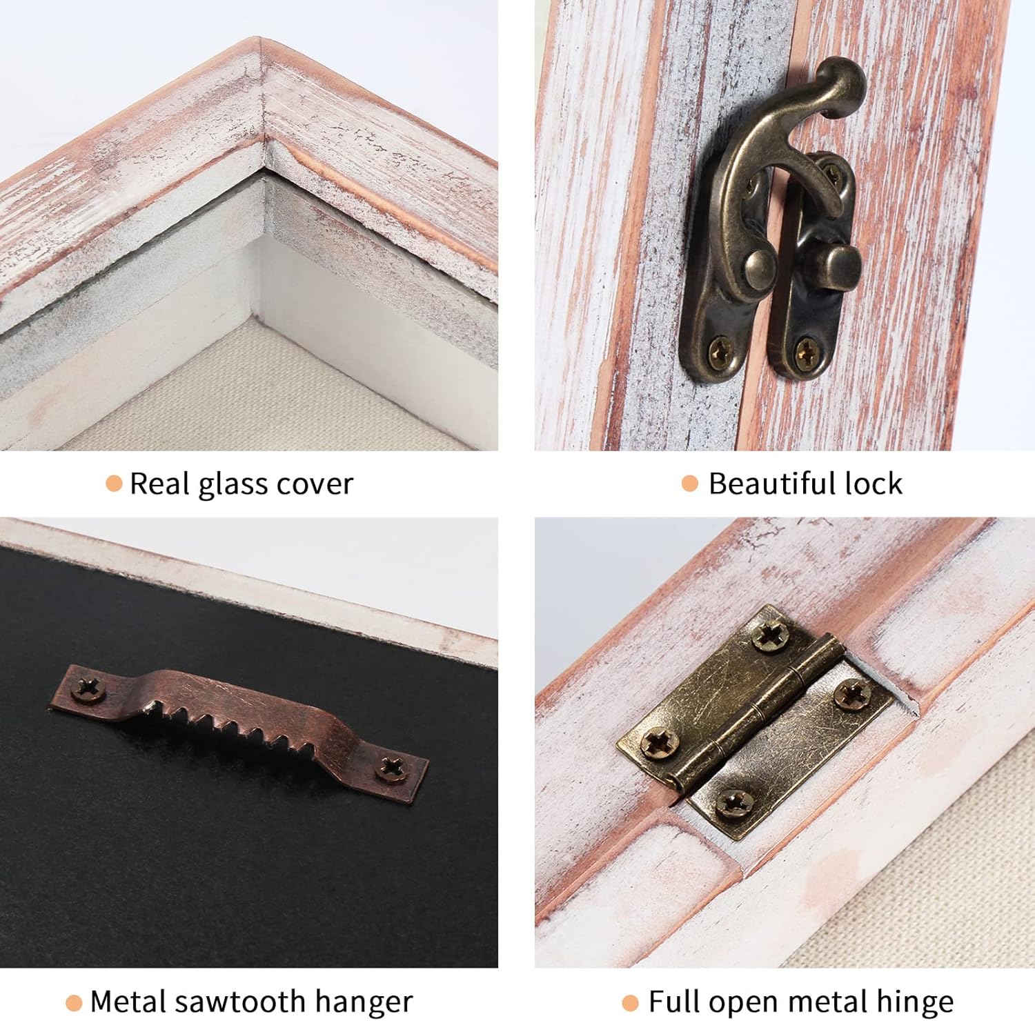 - Hinged Door - The front display door makes it easy to place or exchange items inside. The retro horn lock makes the shadow box lockable and more secure, and prevents the items inside from falling out.