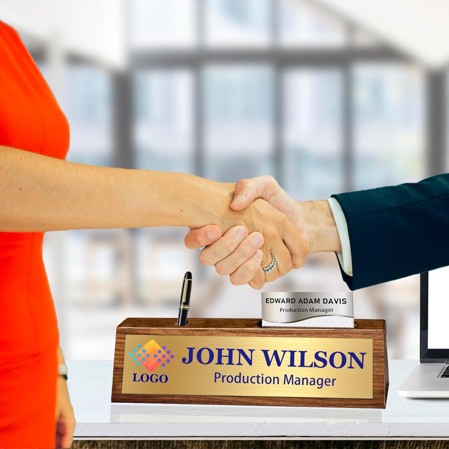 - Print Your Logo and Text:With color printing technology, you can personalize the desk name plate by uploading your logo and choosing font colors that match your brand or style. The plate supports up to two lines of text, perfectly for a standout display of your name and title. Choose to print directly on a brushed gold or silver plate. Designed specifically for text and logo customization. The printing is clear and long-lasting, preserving the elegance of the piece for years to come.
