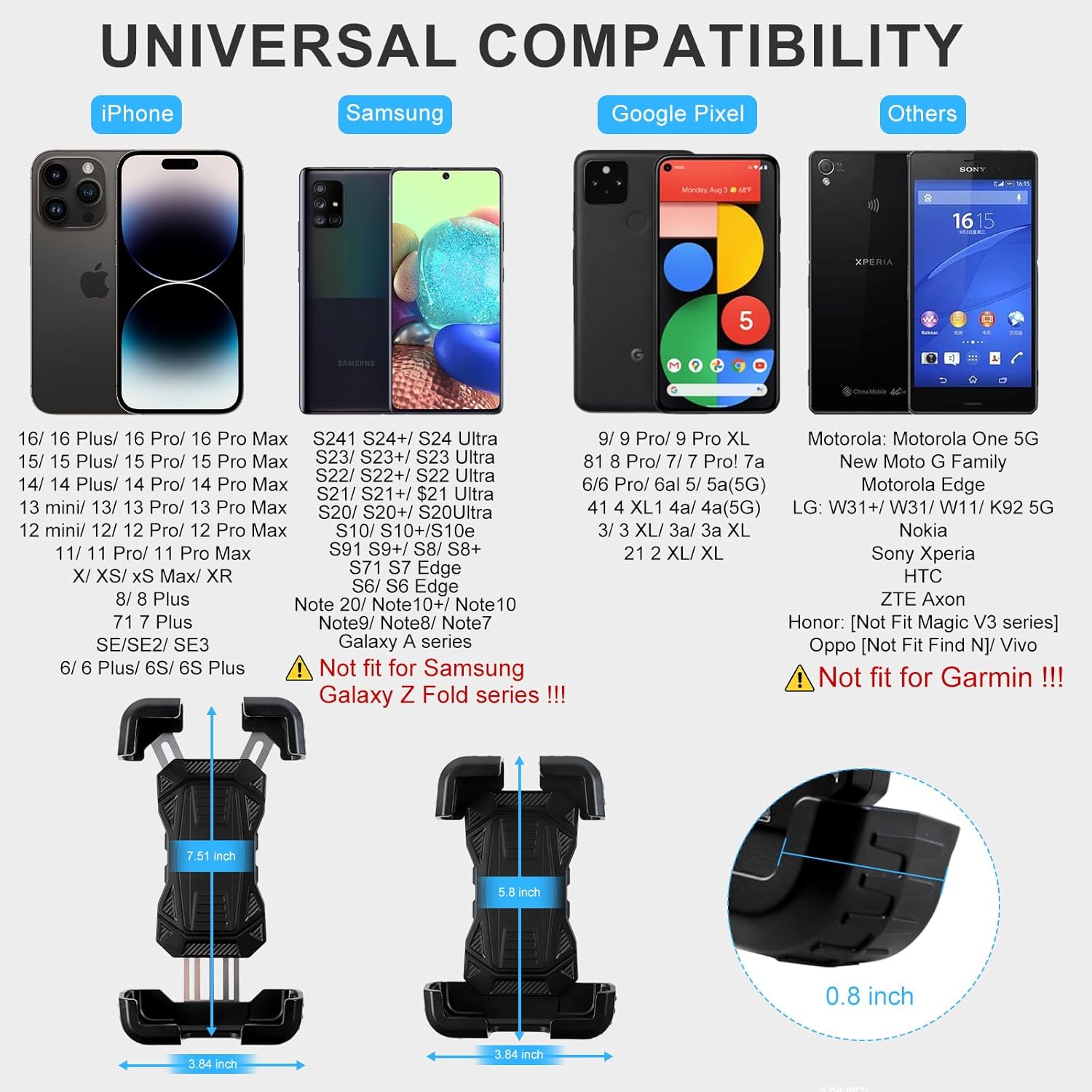 - Universal Compatibility: iLSKW golf cart phone holder mount fits most phone models. Designed for 5.5"-7.58" thick phone cases, such as iPhone, Samsung, Google Pixel, etc. Also suitable for more scenarios, like kitchen, gym, office, as well as golf carts, push carts, golf irons, ATV, UTV, trucks, automobiles and etc