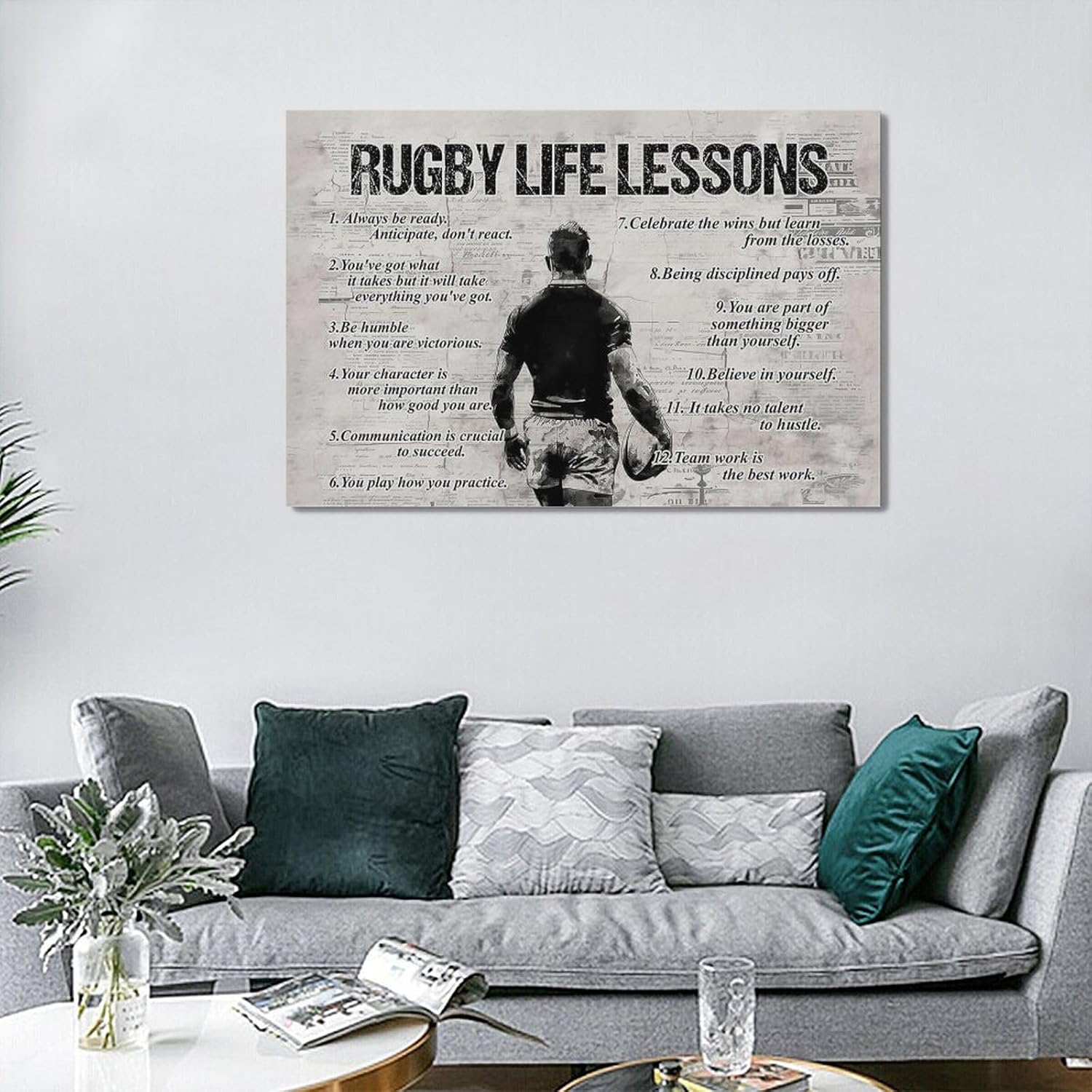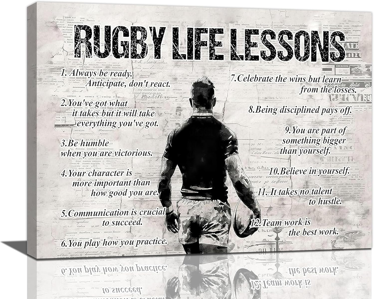 Rugby Life Lessons Wall Art Rugby Sports Wall Decor Rugby Sign Retro Poster Boy Men Motivational Decorations Canvas Print Painting Artwork for Bedroom Bathroom Living Room Gym 24"x16"