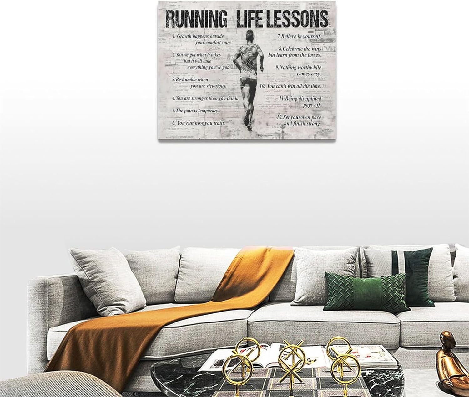 Running Life Lessons Wall Art Running Sports Wall Decor Running Sign Retro Poster Boy Men Motivational Decorations Canvas Print Painting Artwork for Bedroom Bathroom Living Room Gym 16"x12"