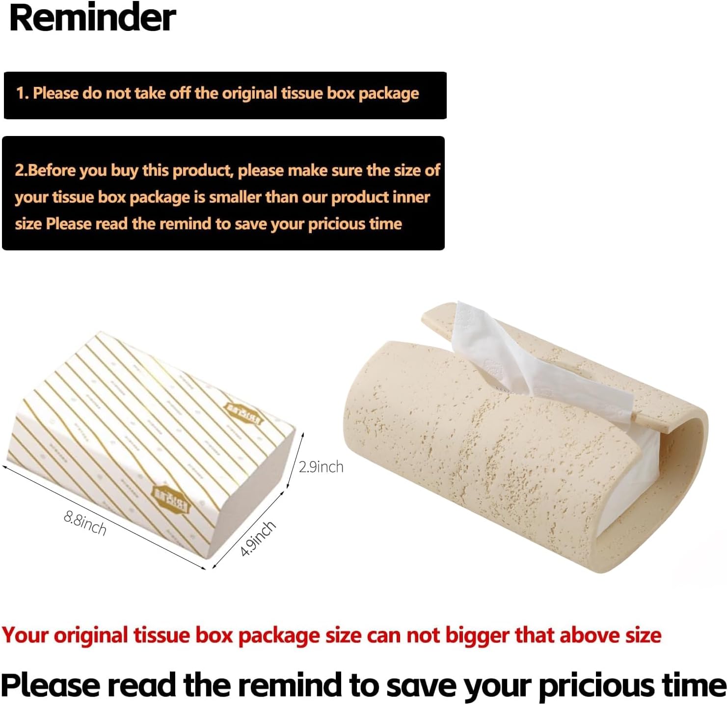 - Suitable Size - Product External Size: 8.86" L X 5.52"W X 3.43"H; It's suitable for a regular or standard rectangular of tissue box, so you don't need to remove the tissues from the original box. NOTE: The size of original tissue box can not exceed 8.8"(Length) x 4.9"(Width) x2.9"(Height)
