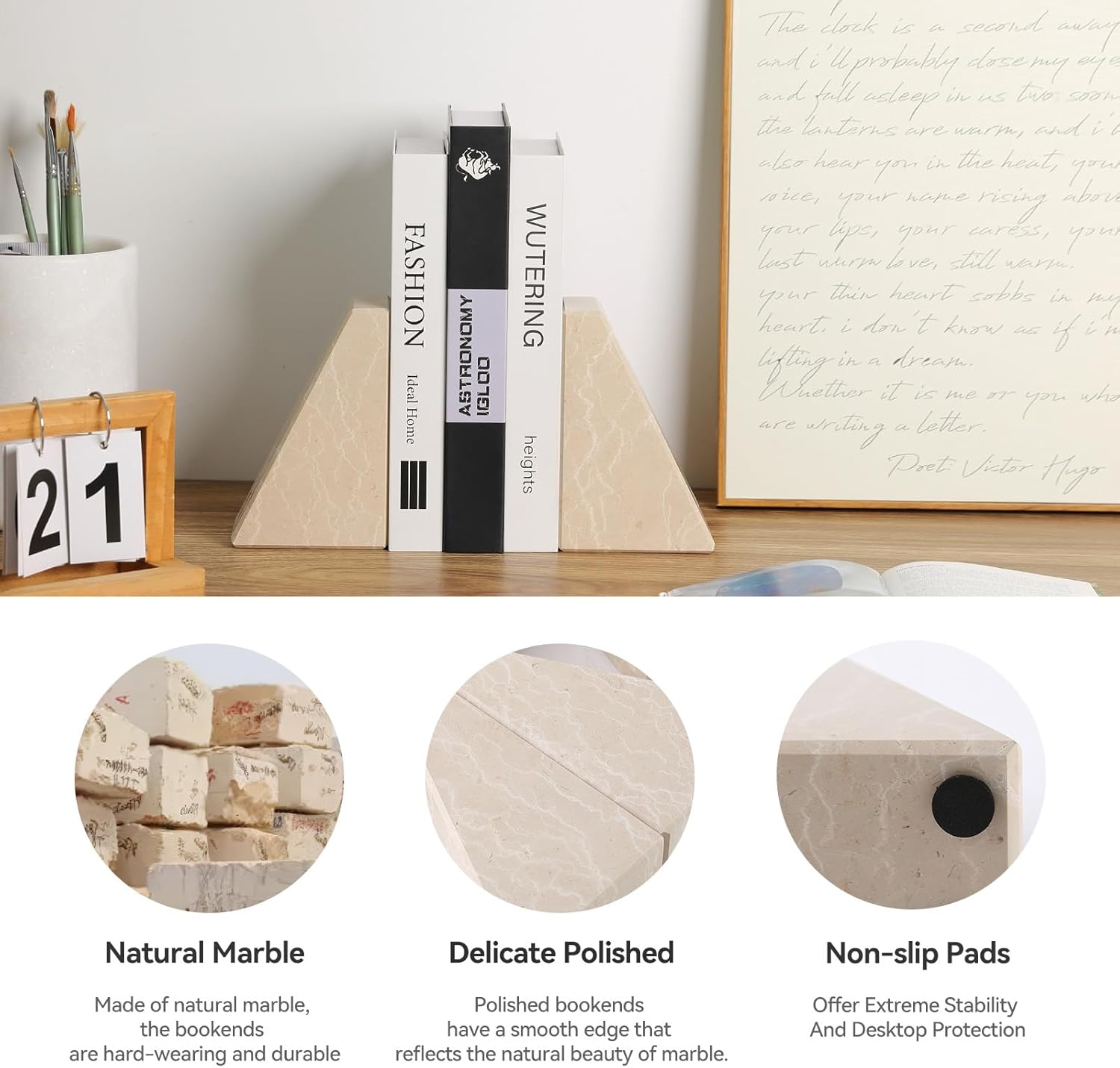 Marble Bookends for Heavy Books, Decorative Book Ends for Shelves, Durable and Heavy-Duty Stone Bookends for Hardback Book & CDS, Unique Book Stopper & Holder, New Jura Beige-Vein, Set of 2