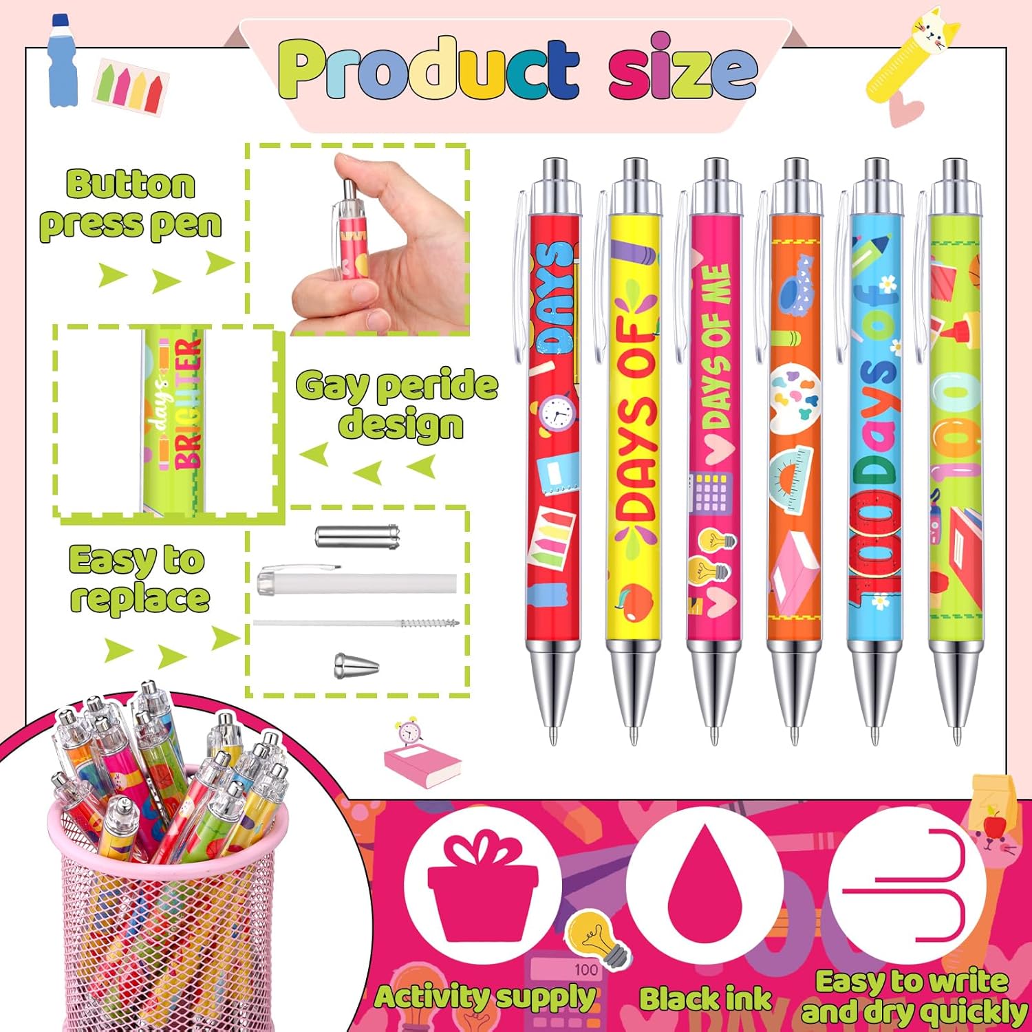 - Bulk Pack: each package comes with a total of 48 100 days ballpoint pens; With such a generous amount, these pens are ideal for sharing the love; Whether it's a 100 days party, or just an ordinary day, there's more than enough happy to go around