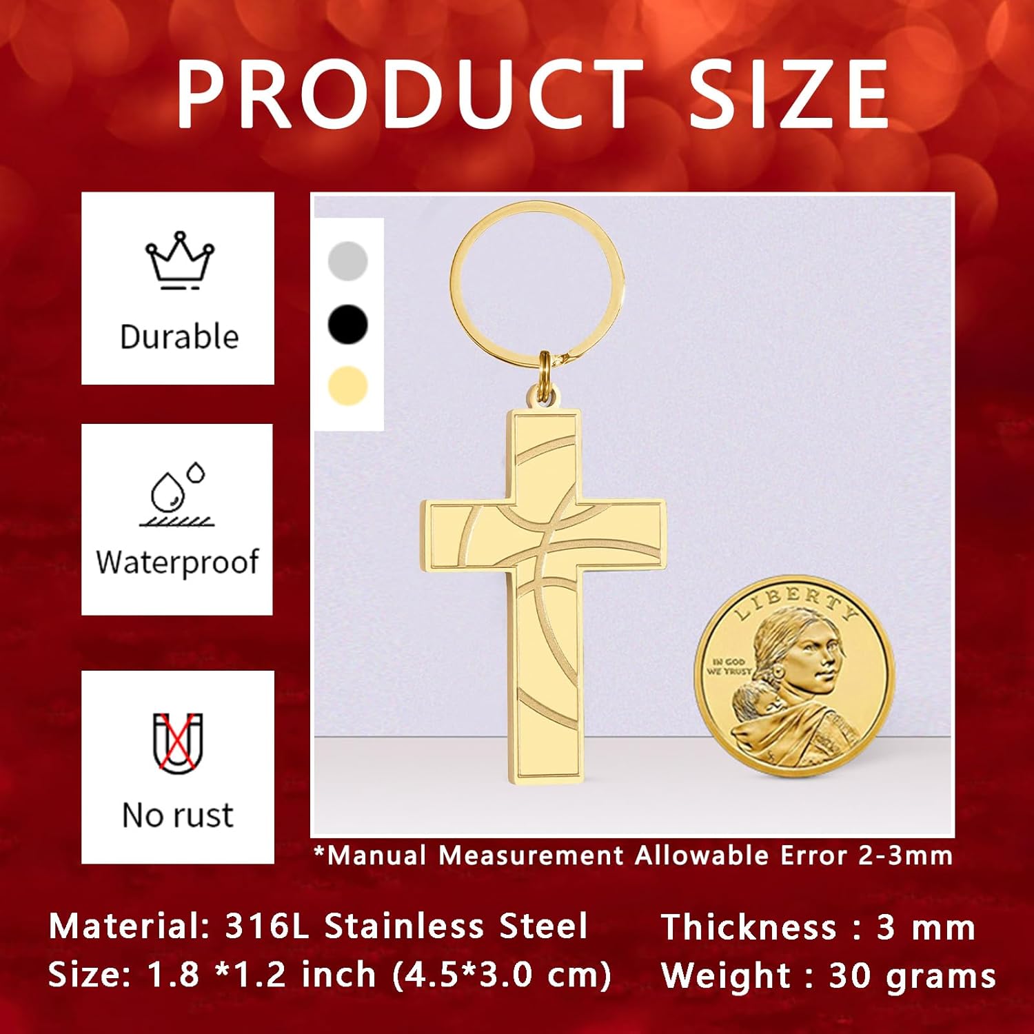 - 【Premium Material】The cross keychains are made of high-quality 316L stainless steel, which are processed by exquisite technology, and are made by advanced machinery in combination with handwork, showing artistic charm and luxury.It is strong and durable, never fades, rusts, corrodes, and is safe for sensitive skin, not itching, no discoloration or irritation.Light-weight design give you a comfortable wearing experience.