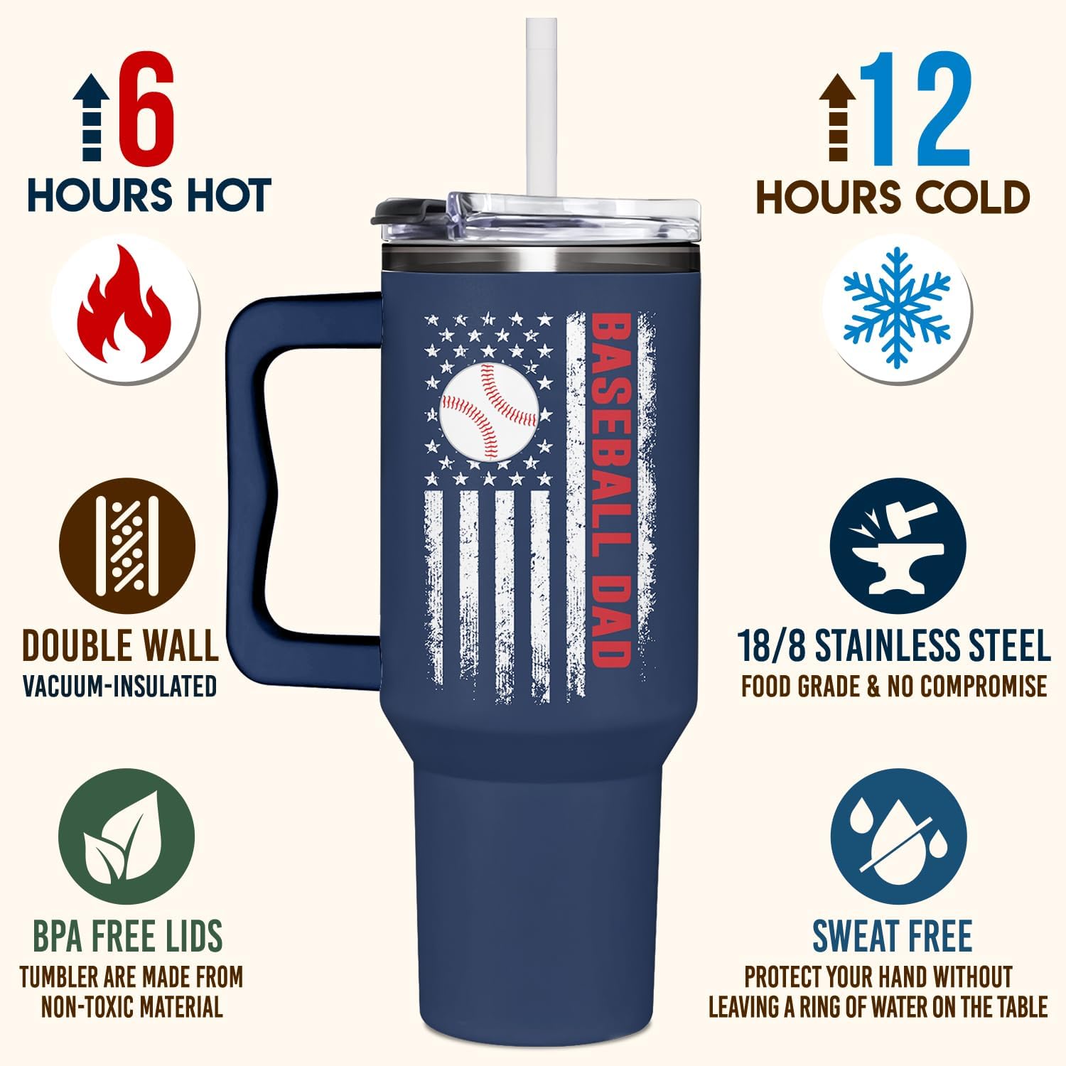 - ✨ SPORTS DAD TUMBLER: This custom baseball tumbler is the ultimate accessory for dads who love the game. Whether he's on the sidelines cheering or coaching, this 40oz tumbler will keep his drink at the perfect temperature. Ideal for baseball gifts, this mug will be a hit for birthdays, holidays, or even as a surprise “just because” gift.