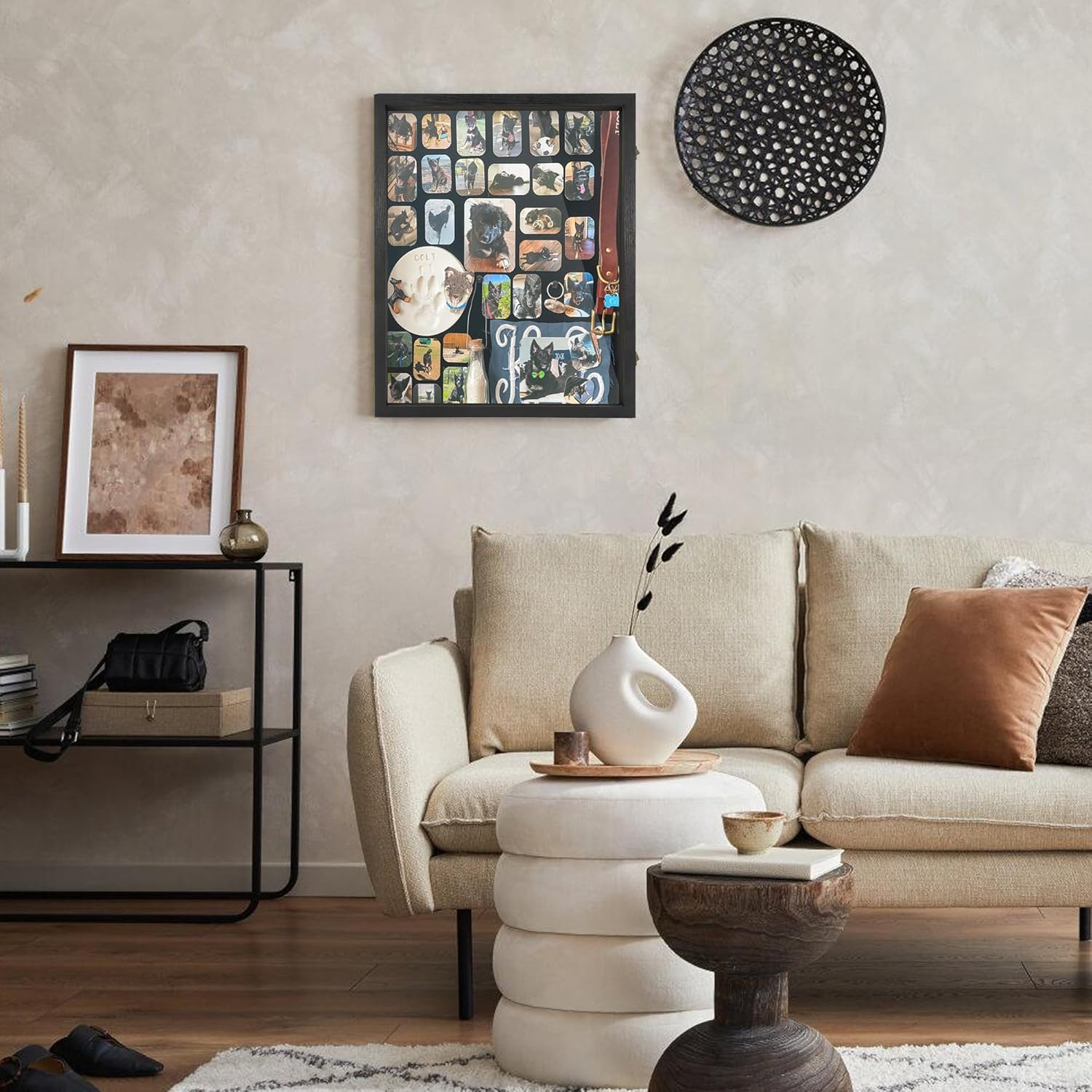 - High-Quality Materials – The 16” x 20” x 2.4'' deep depth shadow box comes with a solid, durable wood frame, woven fabric interior with 10 stick pins, hasp horn lock door with a transparent plexiglass window, and two metal sawtooth hanging hooks on its back.