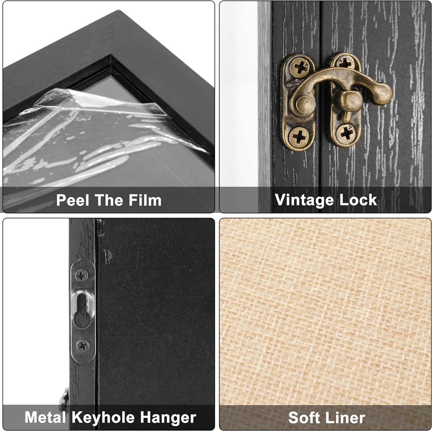 - Hinged Door - The front display door makes it easy to place or exchange items inside. The retro horn lock makes the shadow box lockable and more secure, and prevents the items inside from falling out.