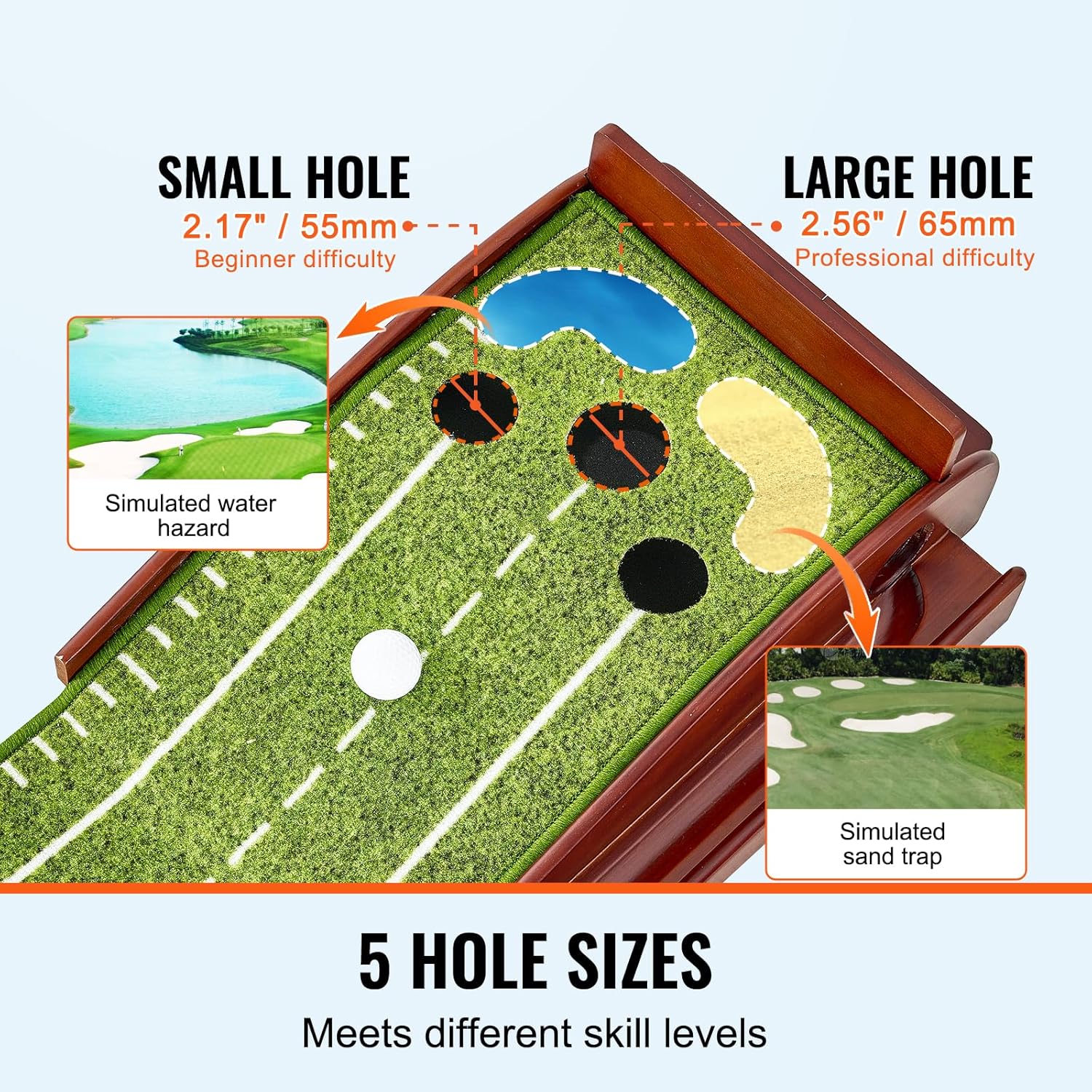 - Uninterrupted Efficient Putting: The automatic ball return system, paired with raised wooden backstops and deepened hole cutouts, prevents golf balls from flying off the mat. When a ball enters or passes through a hole, it hits the backstop and automatically returns to its initial position. The base of the putting mat is crafted from solid wood, ensuring durability and aesthetic appeal. It features three golf ball slots to securely hold golf balls, preventing them from rolling away.