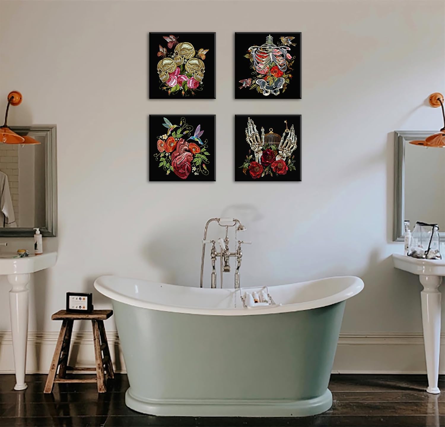 DJSYLIFE Gothic Wall Art - 4-Panel Skeleton and Roses Canvas Print, Dark Moody Decor for Bedroom, Bathroom, Halloween, Ready to Hang 12"x12"x4