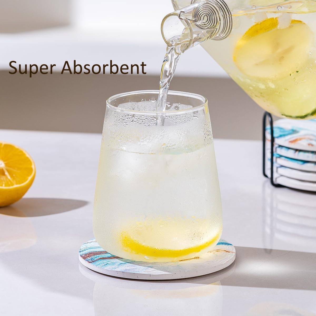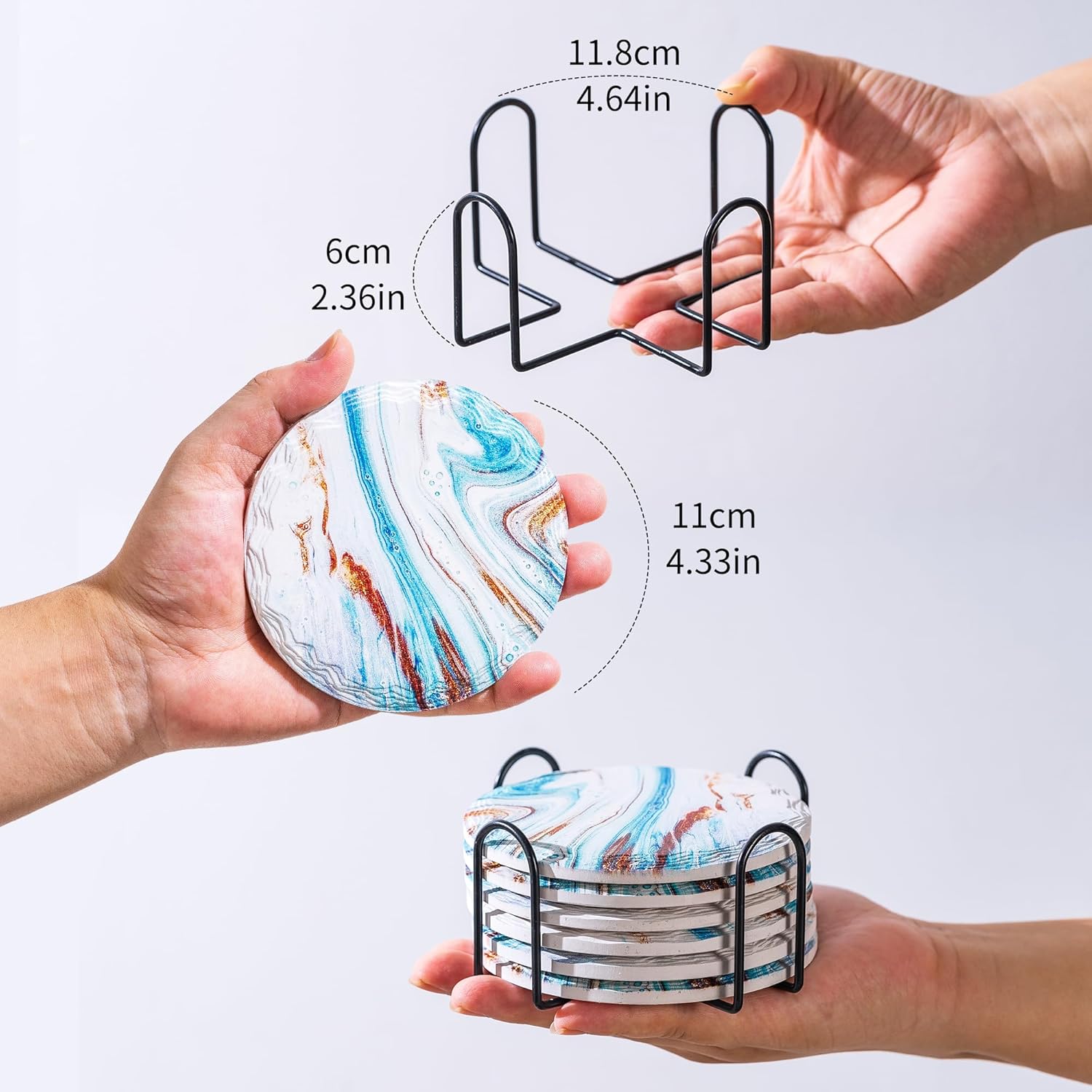 Marble Coasters with Holder Set of 6, Blue Marble Abstract Ceramic Coasters for Drinks, Housewarming Birthday Gifts,