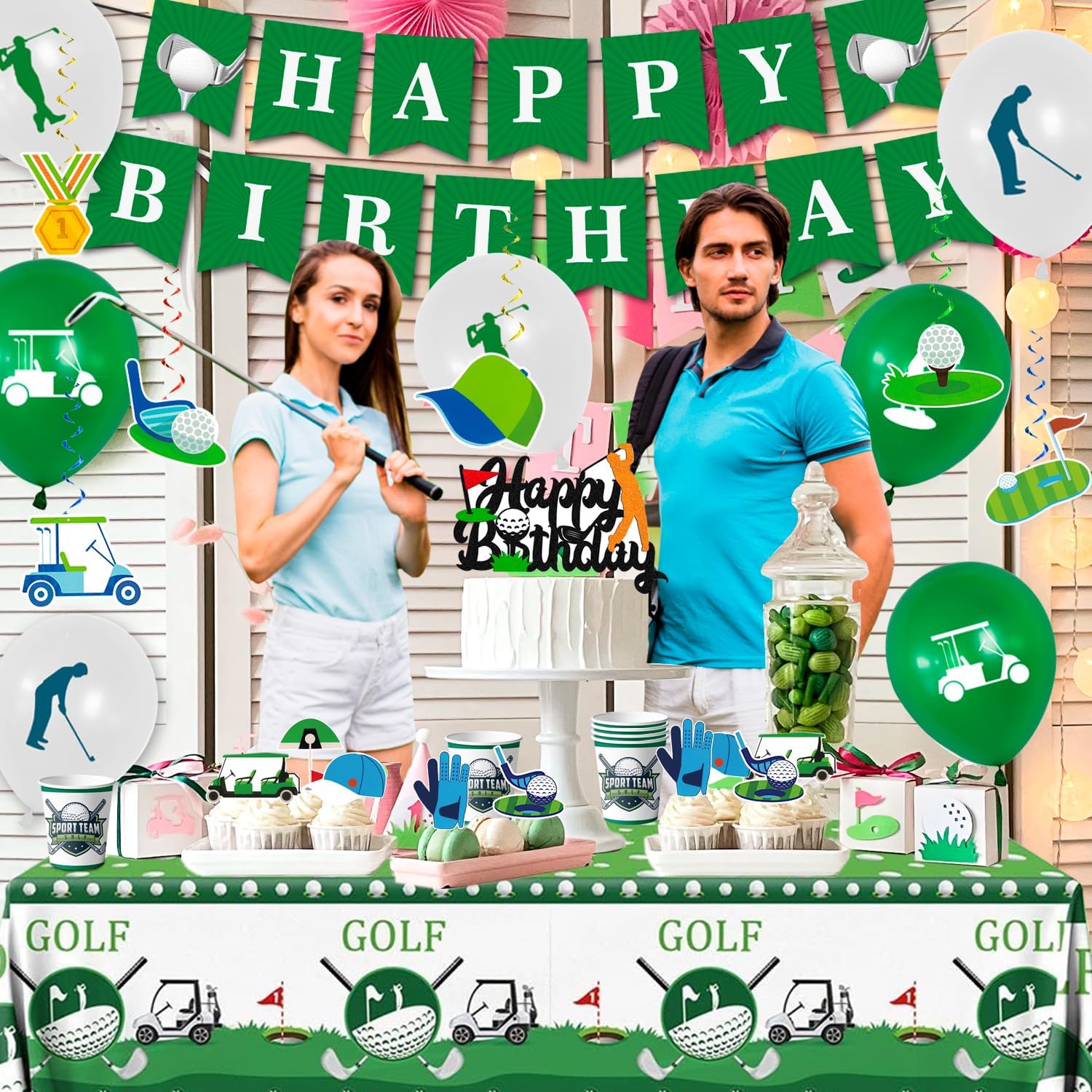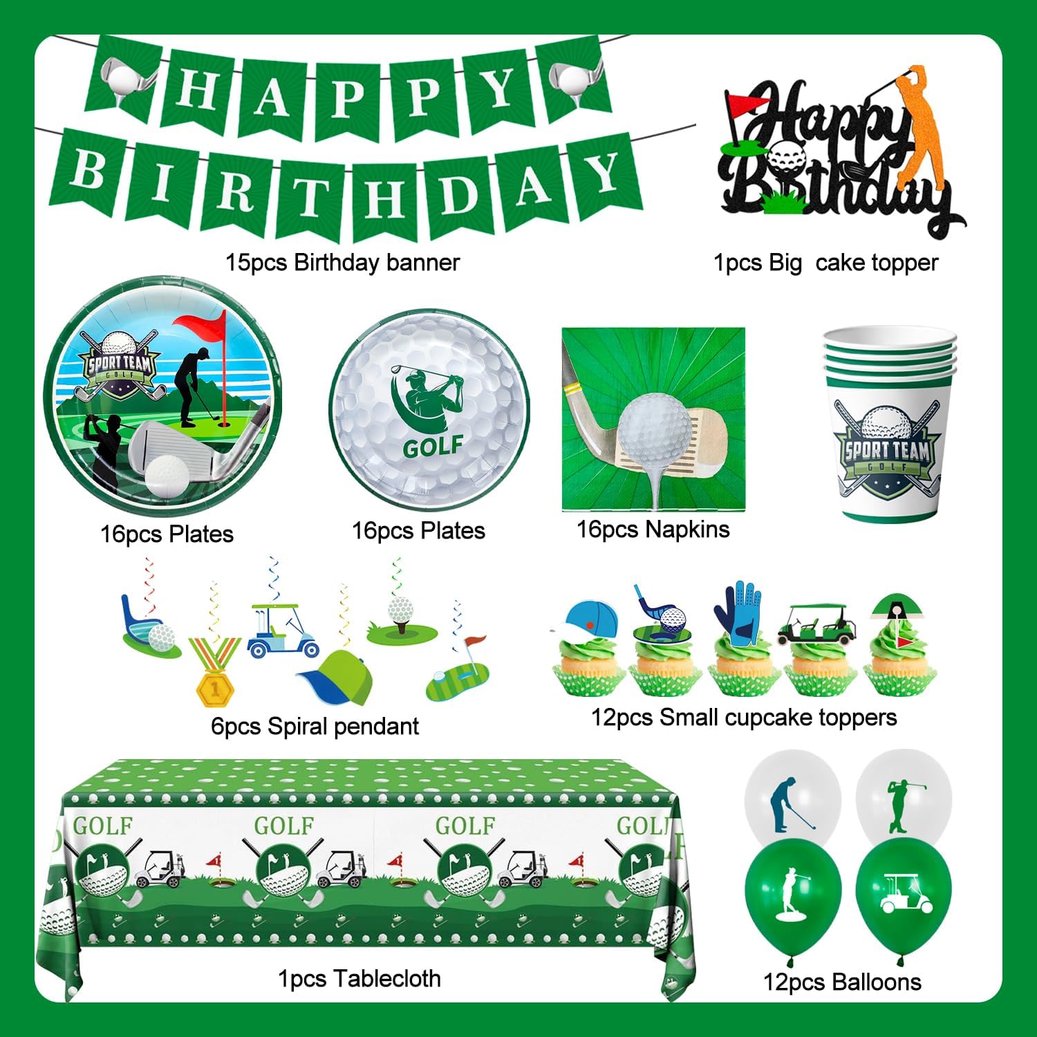 - Golf Birthday Decorations Set: This golf birthday party supplies includes 1 golf birthday banner, 1 golf table cloth, 6 golf party hanging swirls, 12 golf birthday balloons, 13 golf cake decorations, 16 7'' golf birthday plates, 16 9'' golf party plates, 16 golf napkins for party, 16 golf party cups etc golf birthday party decorations
