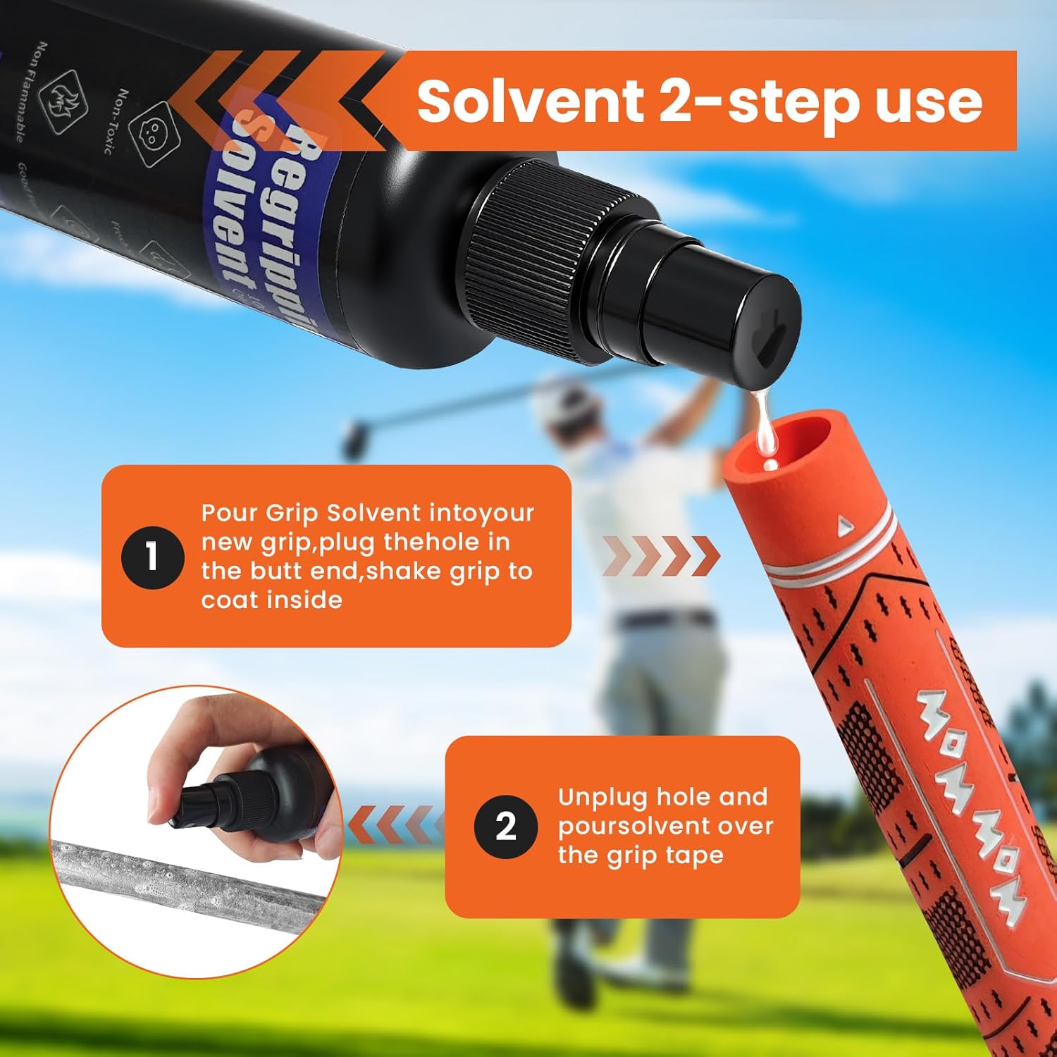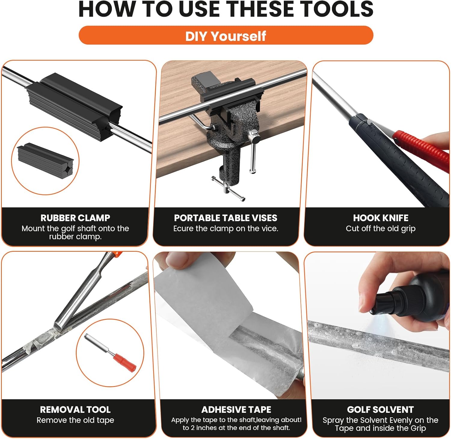 - 【DIY-Friendly & Cost-Saving】:Transform any flat surface into a golf grip regripping station in seconds. With clear tools and simple steps—clamp, remove, tape, apply solvent, and install—you can regrip like a pro while saving time and money on shop repairs