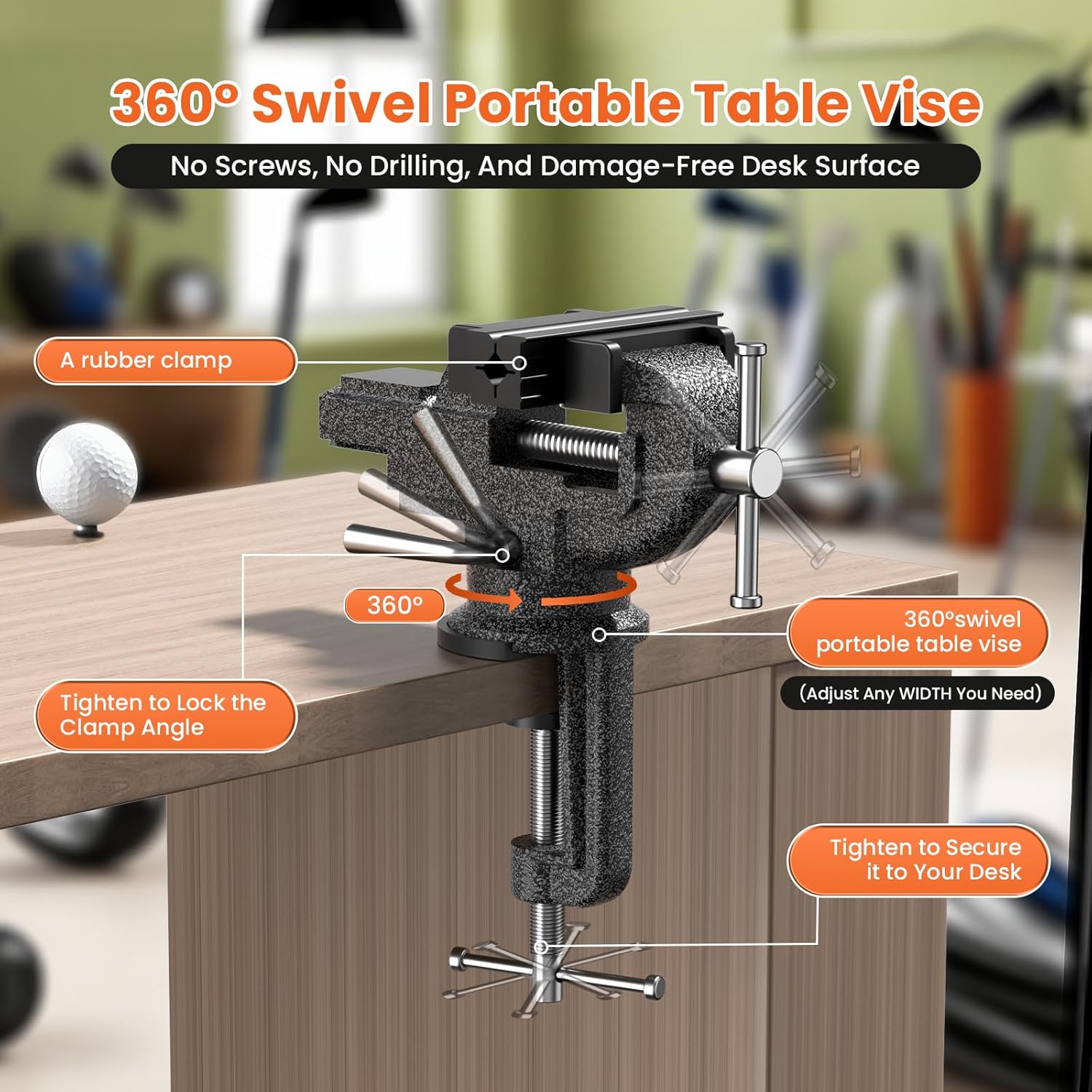 - 【Portable 360° Vise Clamp】:Easily attach the vise clamp to any tabletop without drilling or damaging surfaces. The anti-slip jaws with rubber sleeve hold clubs securely, making regripping safe, stable, and hassle-free. Perfect for use in your garage, workshop, or even on the go