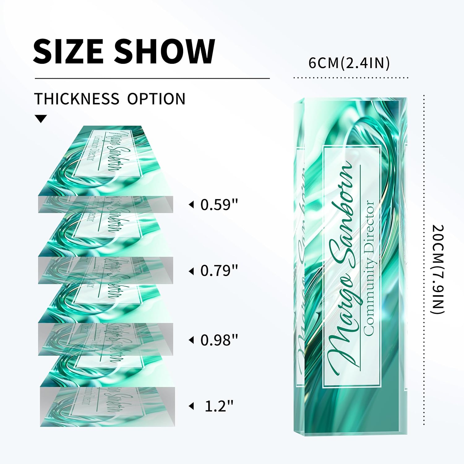 - Desk Name Plate Personalized: We offer 4 name plate thicknesses 0.59, 0.79, 0.98, 1.2 inches thick and a variety of styles for you to choose from ensure your desktop name plate matches your brand's aesthetic and your own personal sense of style, Eye-catching on any desk or bookshelf, this office nameplate can also be used to decorate a desk, give the office a professional look, and communicate important information to clients and employees, And we will update more new styles from time to time.