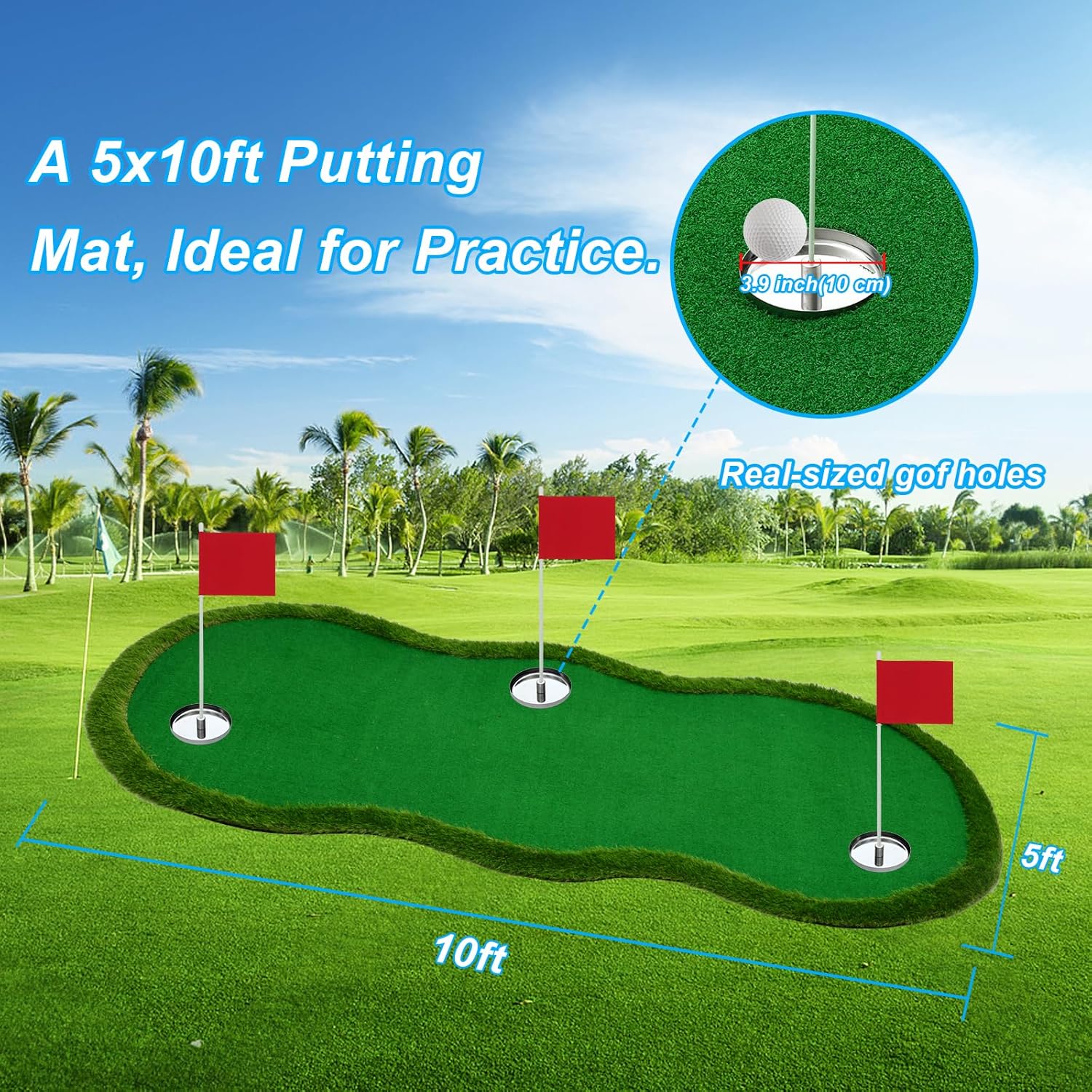 - Professional Golf Putting Practice Mat: This 5x10 ft putting green with 3 holes provides a realistic and professional-grade golf experience right at home. Featuring 10mm putting grass and 40mm artificial turf, the high-quality PP material replicates the look and feel of a real golf green, ensuring a true-to-life putting experience. Whether indoors or outdoors, you can practice your putting skills anytime.