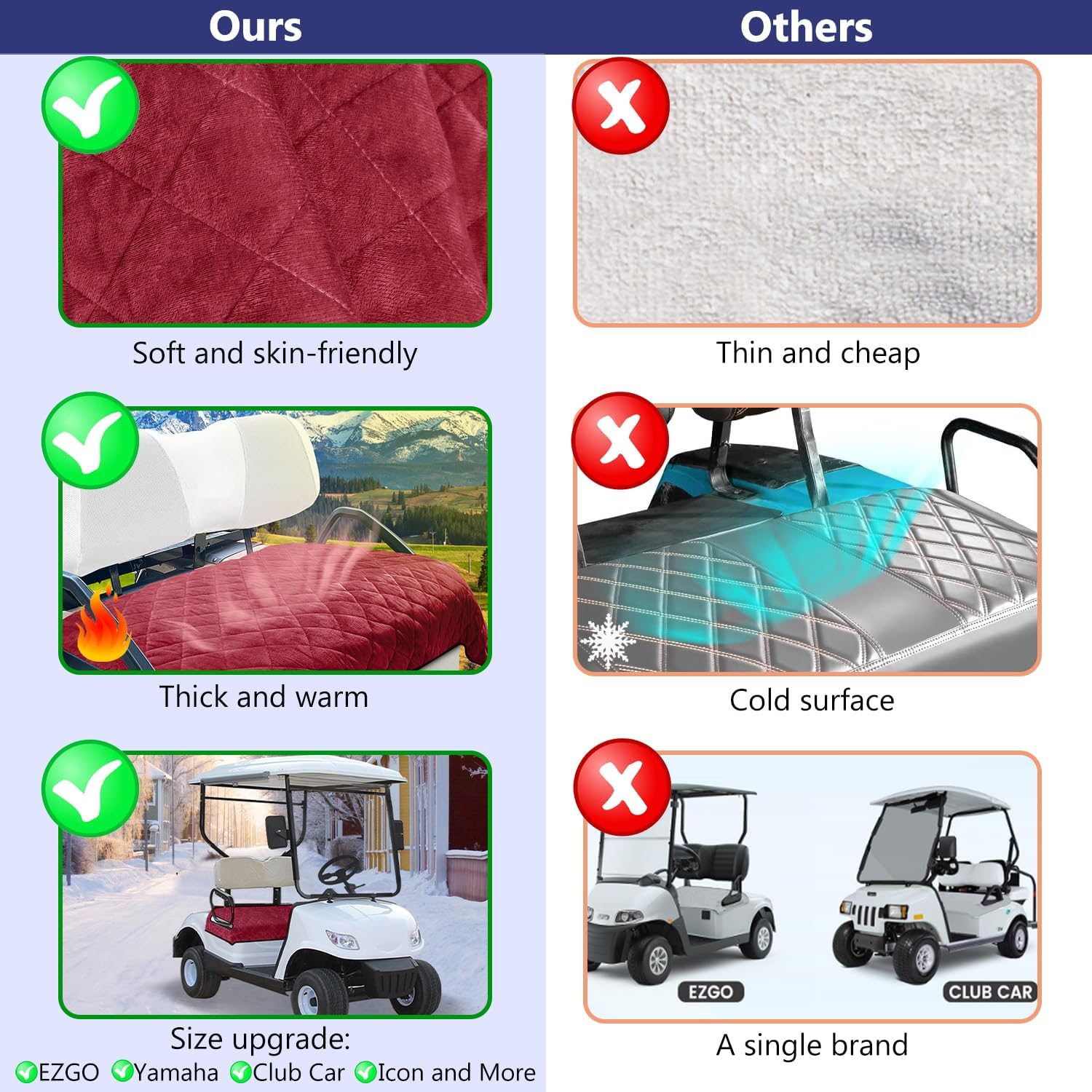 - ăHigh-quality MaterialăOur golf cart seat blanket combines a soft, short-plush surface with a thermally insulating fibre layer and a non-slip dotted back, ensuring comfort and a secure fit.