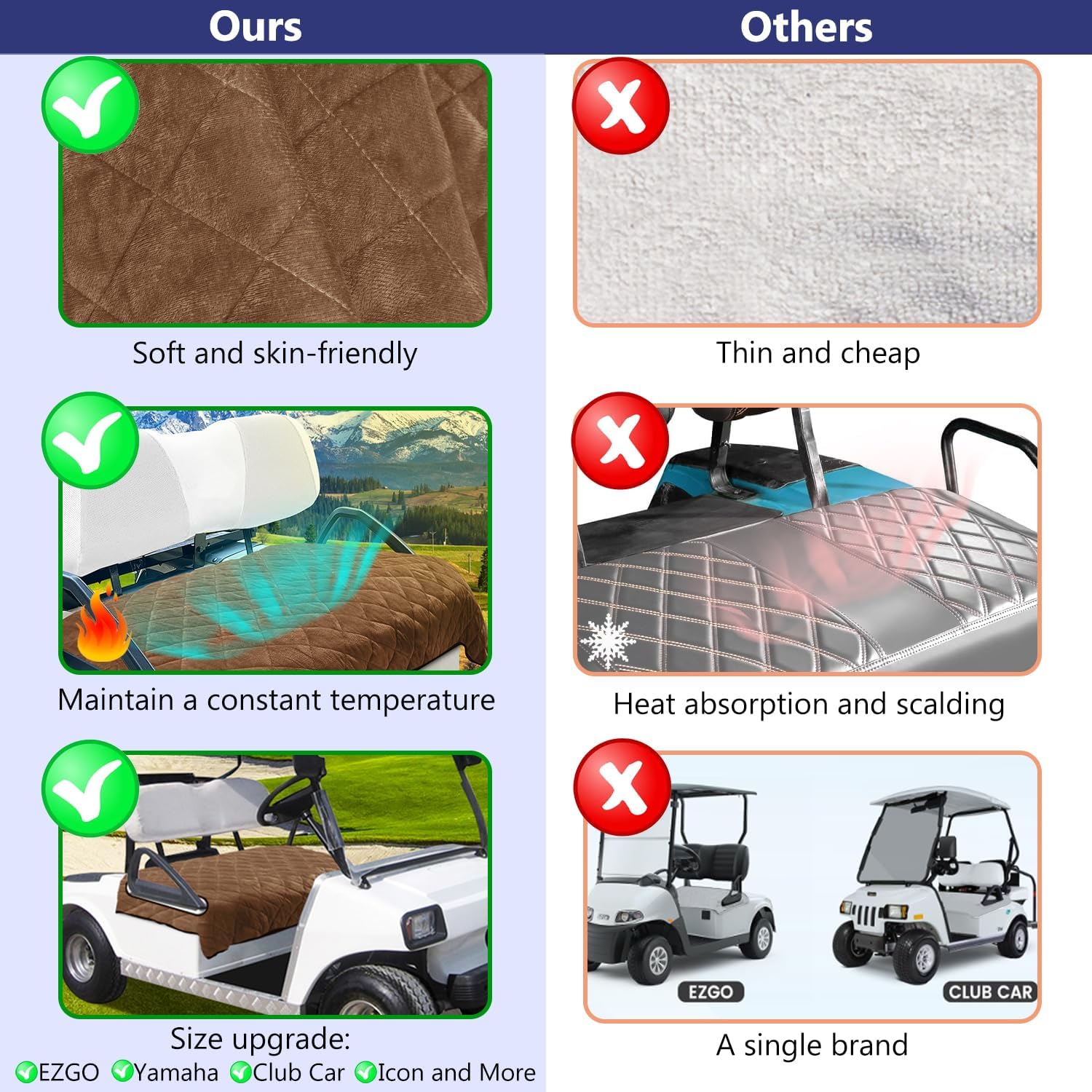 - ăHigh-quality MaterialăOur golf cart seat blanket combines a soft, short-plush surface with a thermally insulating fibre layer and a non-slip dotted back, ensuring comfort and a secure fit.