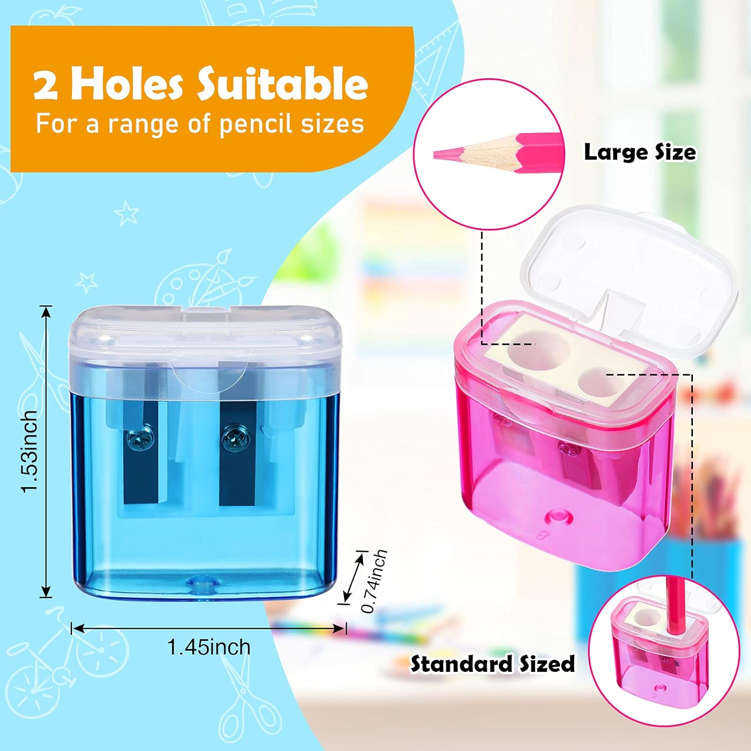 - Two Hole Design: the colorful pencil sharpeners are designed with two different size holes, suitable for shaving pencils and crayons of large and small diameters, which enables them to satisfy the needs of any student, teacher, artist, or officer; These pencil sharpeners can solve problems for you, provide you with convenient and efficient tool for working and studying