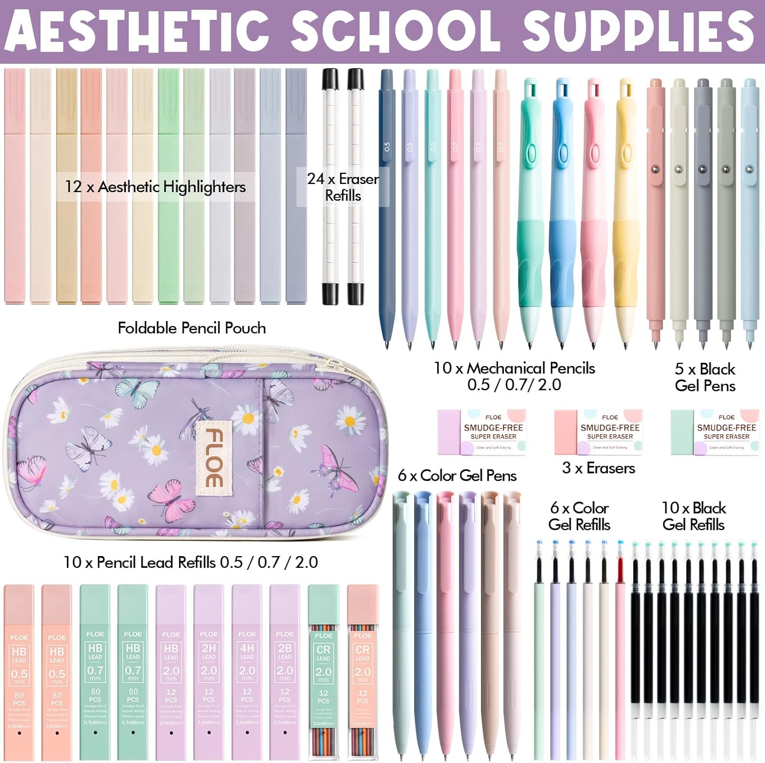 - AESTHETIC SCHOOL SUPPLIES VALUED PACKAGE: Includes 1 pencil pouch, 12 pastel bible highlighters, 5 black gel pens & 10 black refills, 6 color gel pens & 6 color refills, 6 mechanical pencils 0.5 0.7mm and 4 tubes of lead refills 0.5, 0.7mm (80pcs/tube), 4 mechanical pencils 2.0mm with 4 tubes of black lead refills (12pcs/tube) & 2 tubes of color lead refills (12pcs/tube), 3 erasers, 24pcs eraser refills. This ultimate stationery set is ideal for writing, journaling, highlighting, sketching, etc