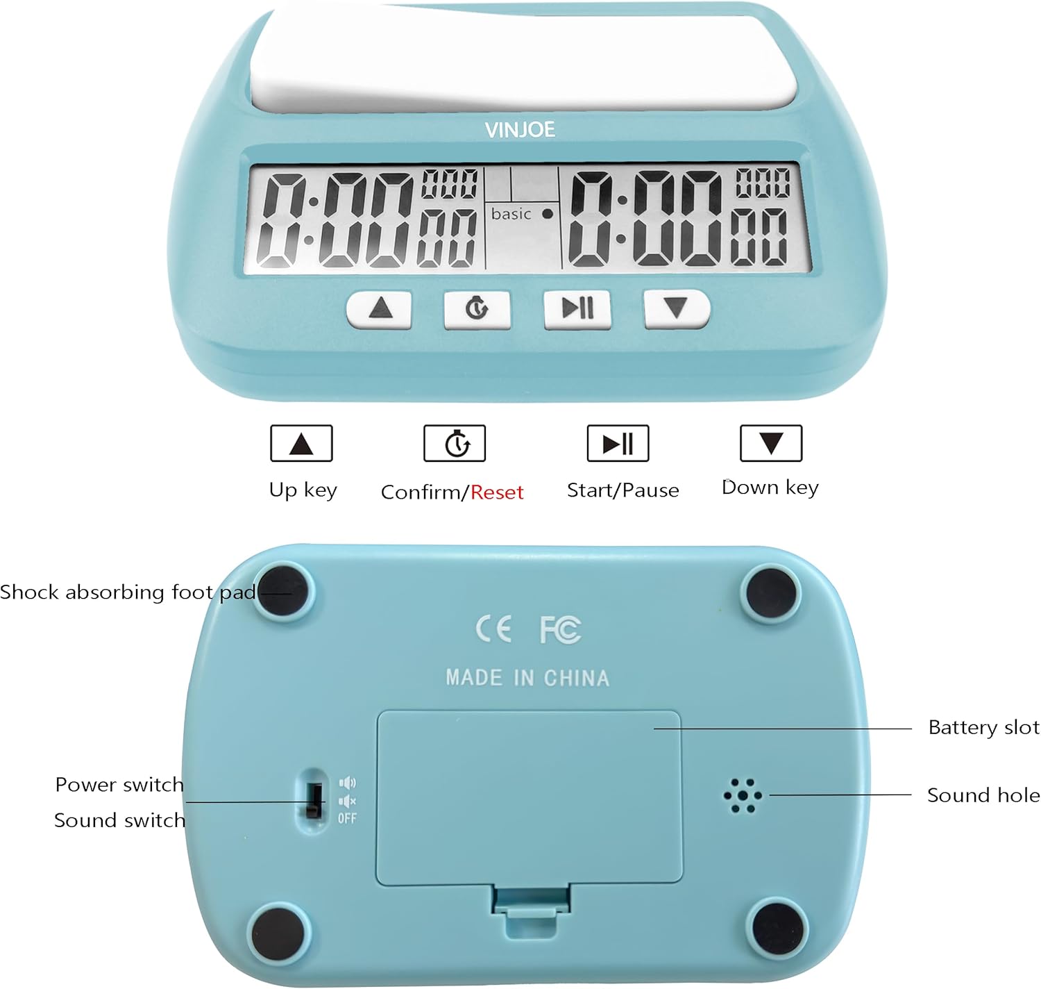 - ♟️【Four functions】♟️ VINJOE digital chess clock has four functions, Basic, Bonus, Delay and Positive Time Features. This portable chess clock can meet the timing functions required for most two-player board games, and four different timing functions add a lot of fun to the game. There is also a most special function, that is, you can return to the initial setting timing rules with one key, avoiding the trouble of restarting or pressing it several times