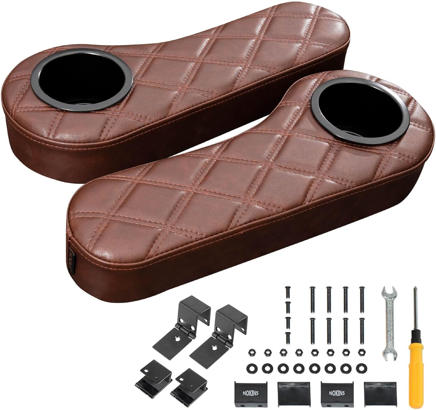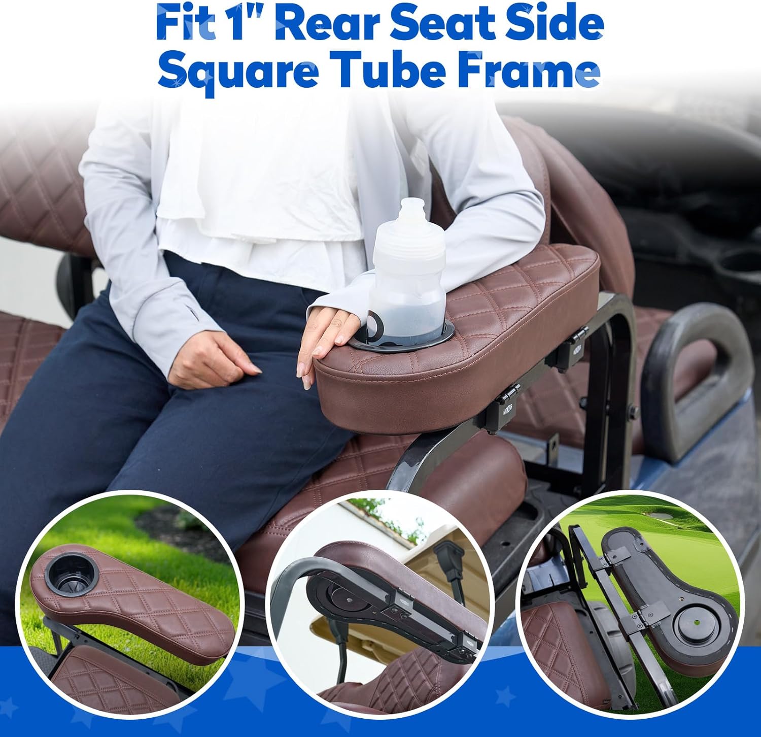 NOKINS Golf Cart Armrest with Cup Holder for EZGO/Club Car/Yamaha, No Drilling Required, Golf Cart Flip Hinged Armrest for Rear Seat with 1 inch Square Tube Frame (Brown&Brown 8438)