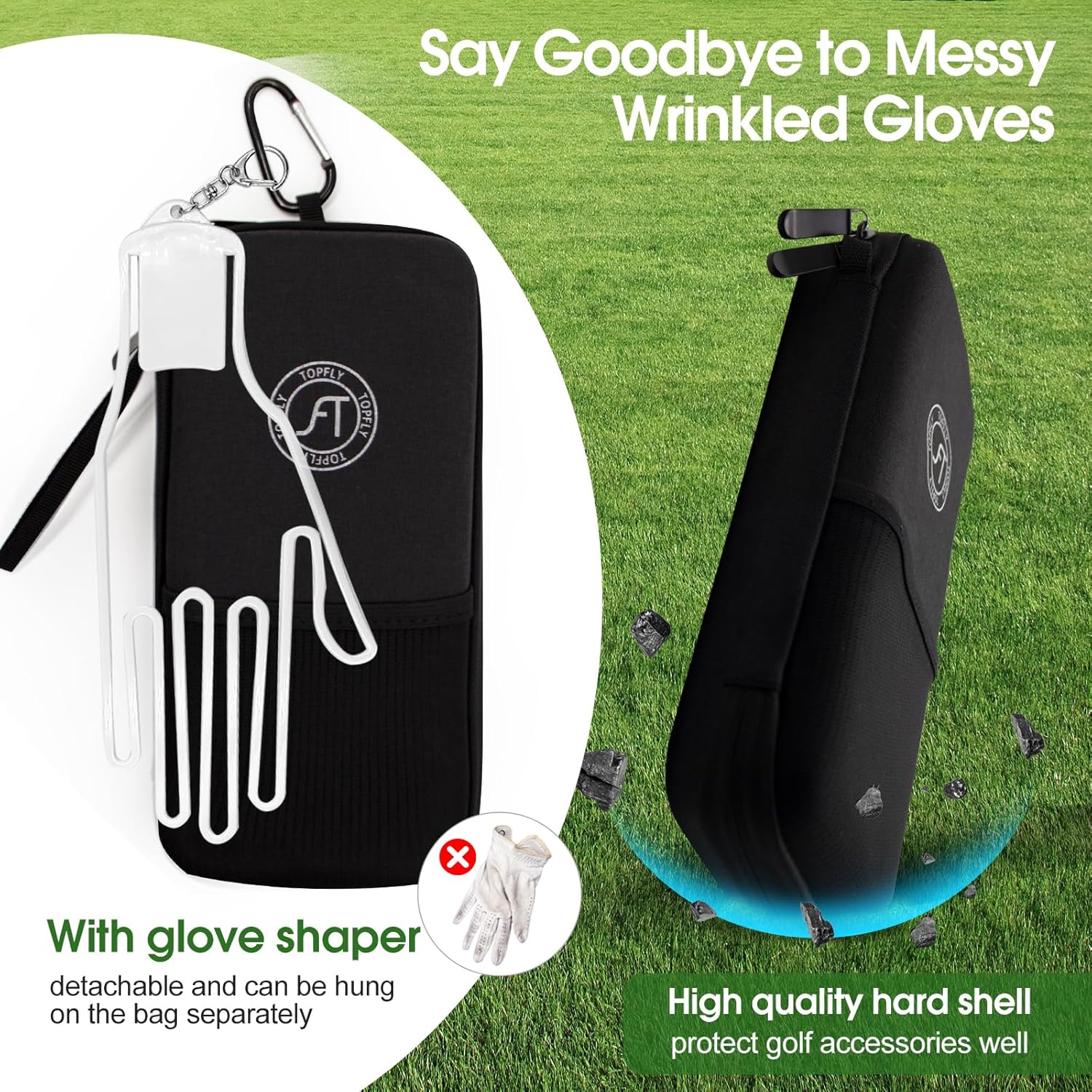 - Excellent Glove Shaper: Topfly golf accessory bag comes with a removable golf glove stretcher to keep the shape of golf gloves. Keep your gloves wrinkle-free after use and store your essential gloves well