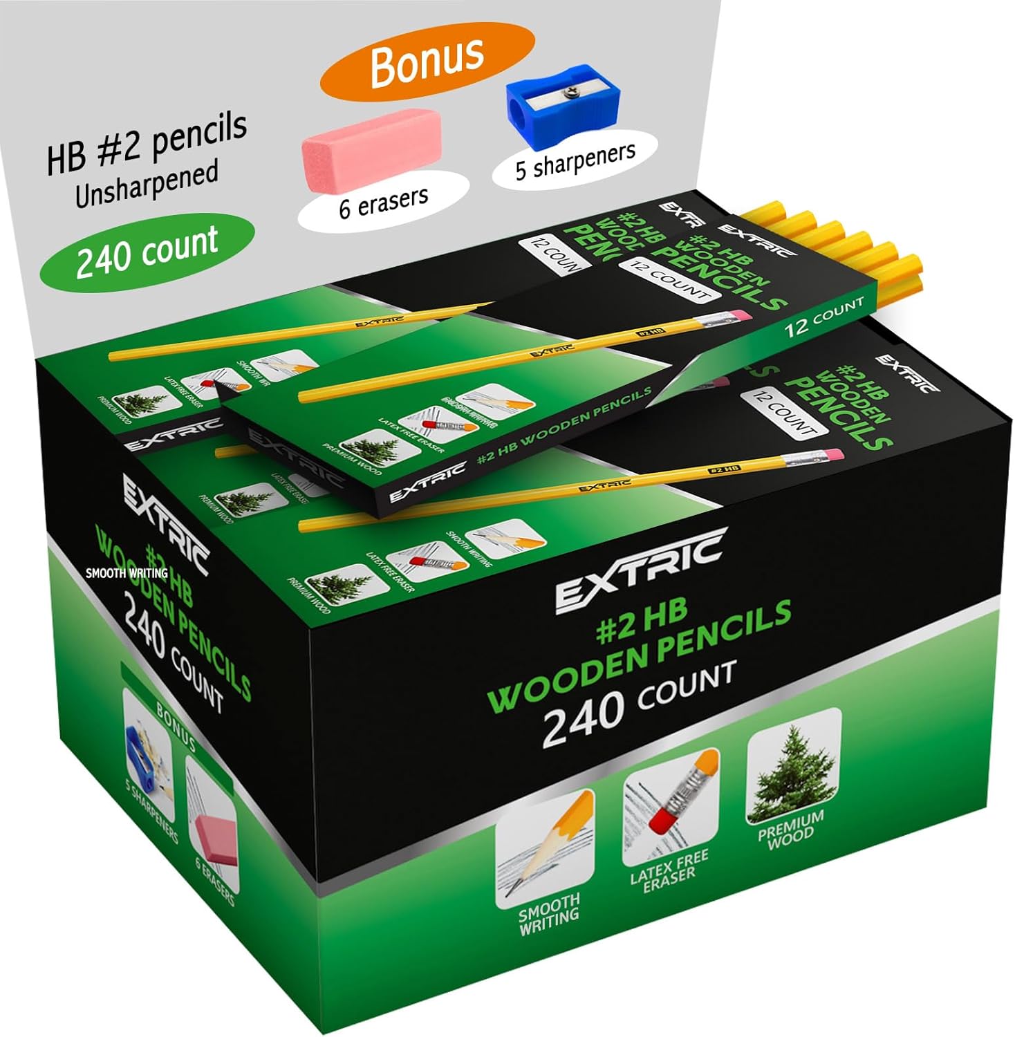EXTRIC Wood-Cased Pencils HB #2, 240 Count Yellow Pencils with Top Eraser, Unsharpened, Hexagonal Grip, Bulk Pack for School, Office and Teacher Supplies