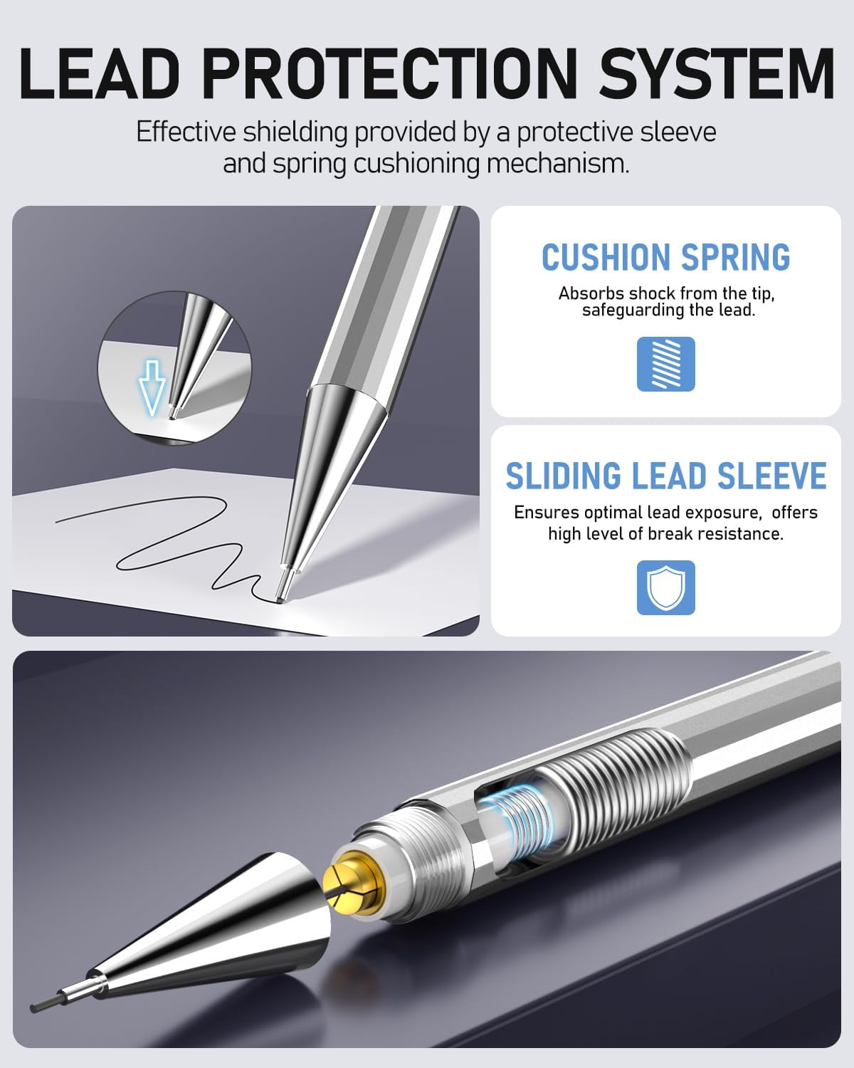 - No Slip and Easy to Use: The lead mechanical pencil comes with a metal clip and a polygonal barrel to avoid slipping on the desktop; This pencil is easy to use, anyone can easily load and advance lead