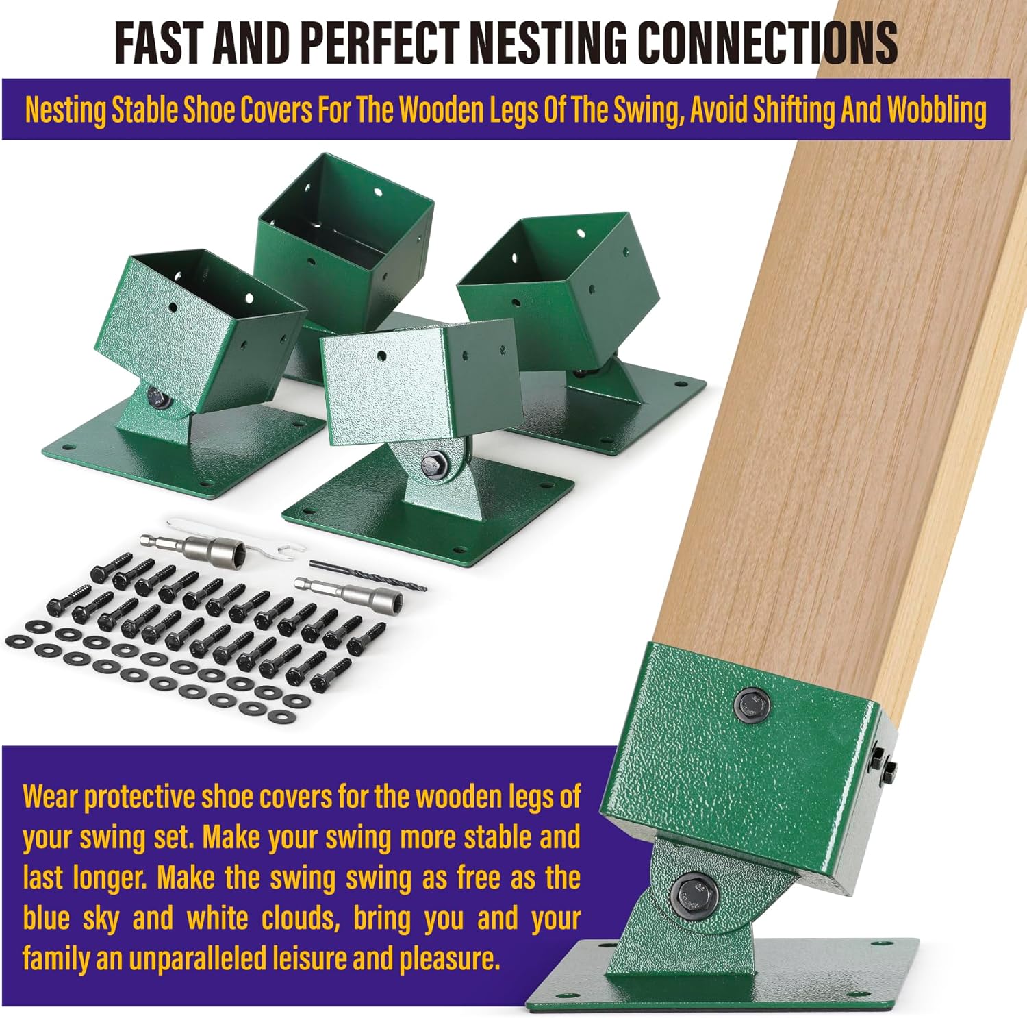 - Adaptability: Fits standard 4"x4" (actual 3.5"x3.5") swing legs nested. Adjustable pivot design, Can be adapted to any spread angle (range: 45°-60°) of the swing legs; Vertical tilt angle of the bracket is 75° inward, Can be combined with most of the swing bracket installation. Non-slip plastic pads on the bottom of the swing set allow it to be placed on grass or hard surfaces, Preventing scratches on the ground due to friction.