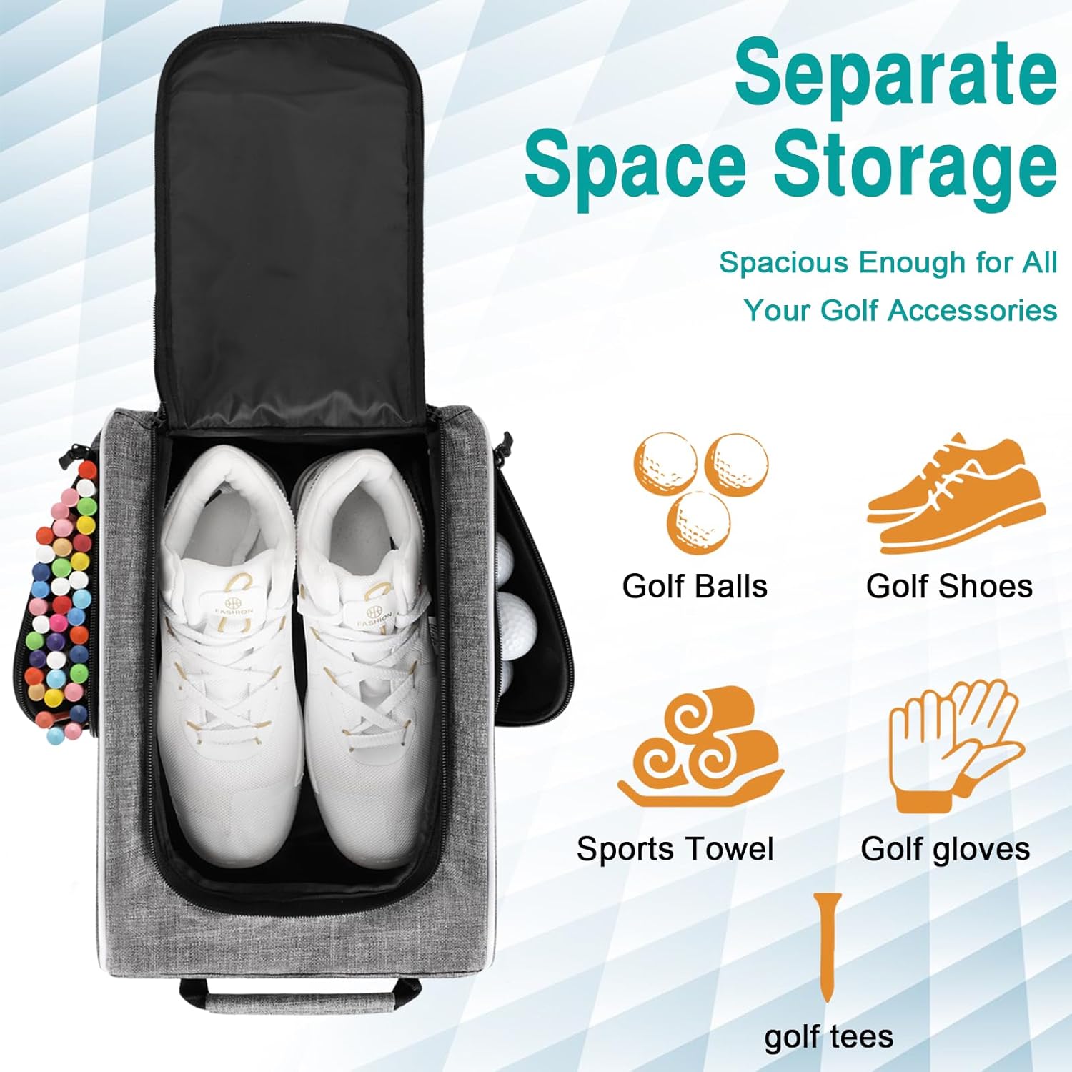 - KEEP YOUR SHOES WITH YOU ANYWHERE - The golf shoe bag allows you to easily carry your shoes wherever you travel. Keep this stored in your trunk for a day on the course. Convenient side pockets can store tees, golf balls, socks, etc