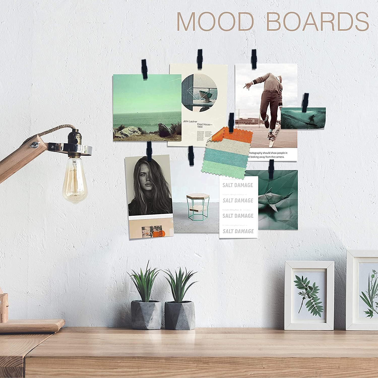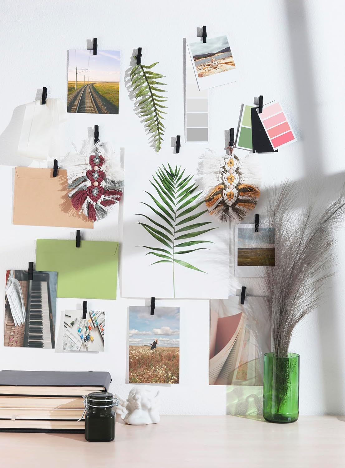 50 Pack Mini Self Adhesive Clips for Pictures - Black Wood Clip Photo Holders for Wall, Poster Hanger, Photo Cards Hanging Display Board & Picture Boards, Artwork Photos Holders Card Room Decor