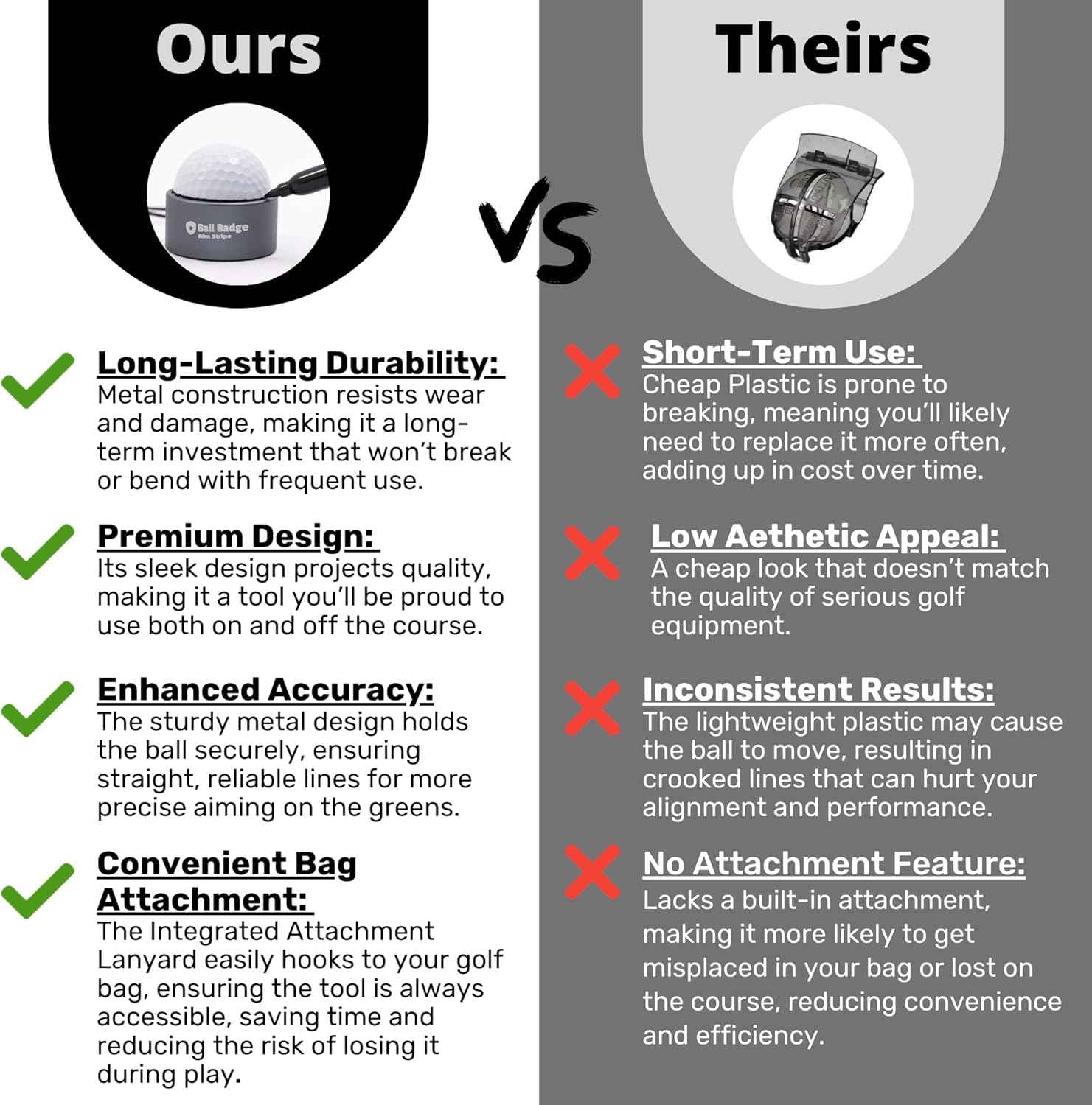 - PRECISION ALIGNMENT TOOL FOR GOLFERS - The Ball Badge Aim Stripe is a 360-degree golf ball line marker kit designed to enhance your putting accuracy and alignment. Create perfect lines on your golf balls to improve your aim and precision on the green.
