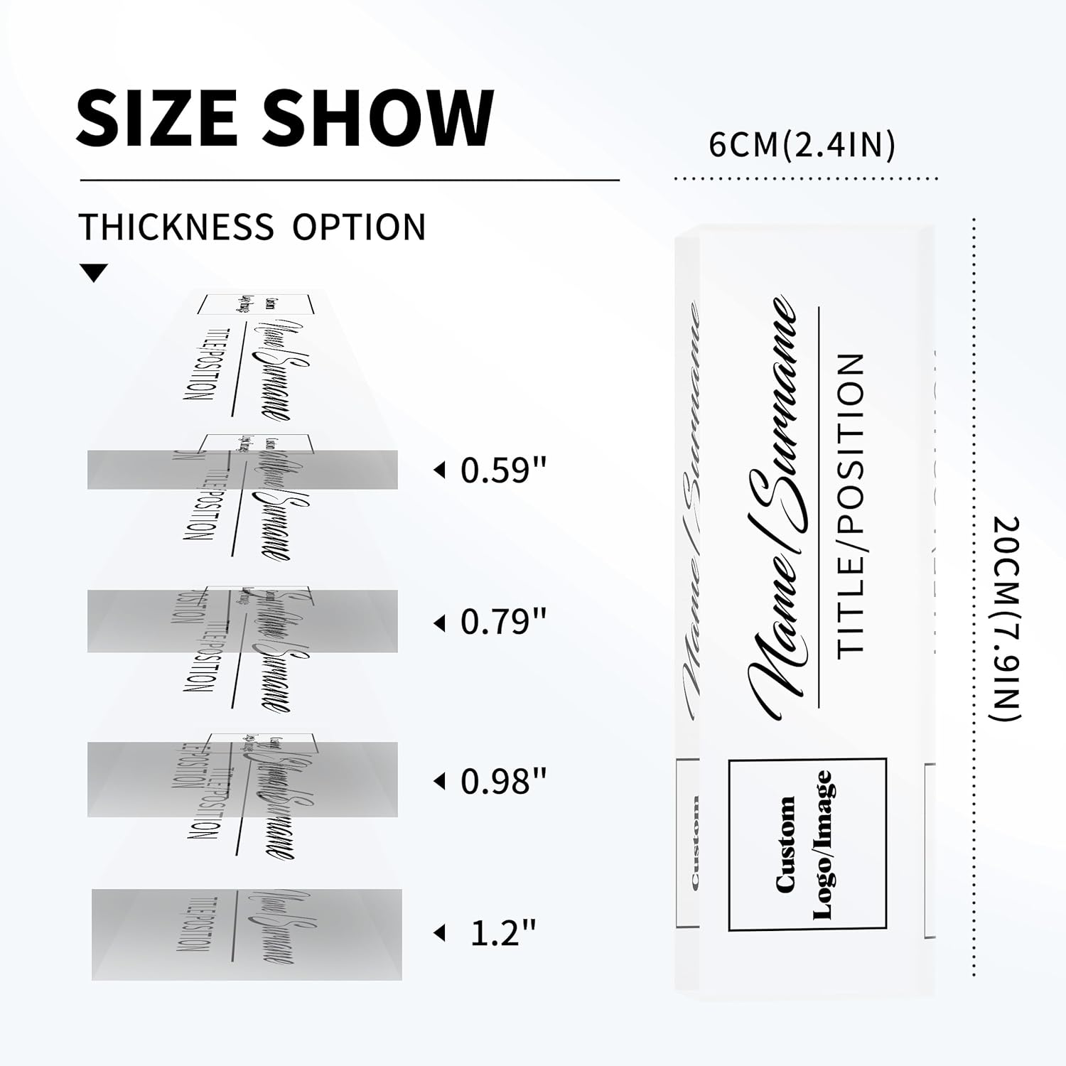 - Desk Name Plate Personalized: We offer 4 name plate thicknesses 0.59, 0.79, 0.98, 1.2 inches thick and a variety of styles for you to choose from ensure your desktop name plate matches your brand's aesthetic and your own personal sense of style, Eye-catching on any desk or bookshelf, this office nameplate can also be used to decorate a desk, give the office a professional look, and communicate important information to clients and employees, And we will update more new styles from time to time.