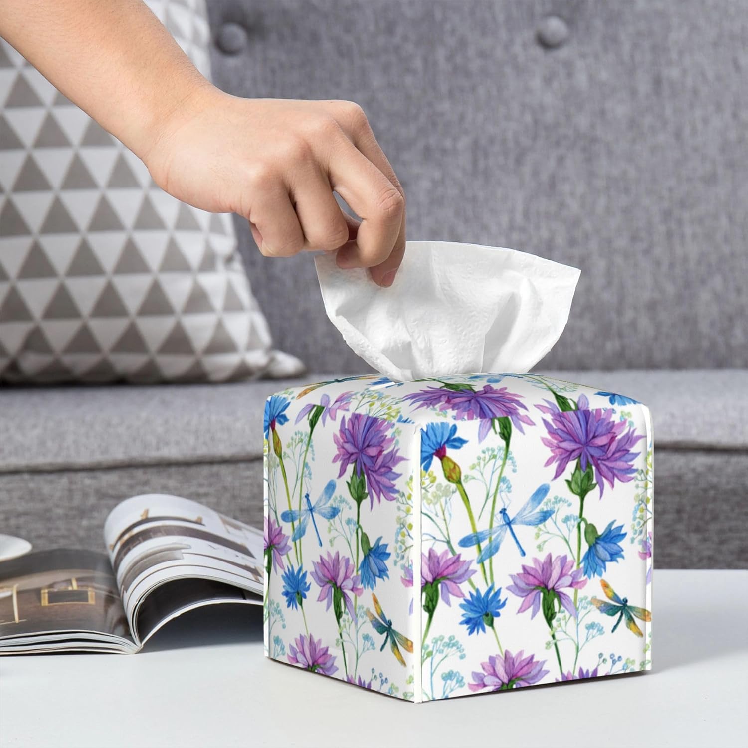 Watercolor Flowers and Dragonflies Tissue Box Cover Square,Purple Blue Floral Tissue Box Holder Waterproof Leather Facial Paper Organizer Dispenser for Bathroom Home Car Nightstand Vanity Desk