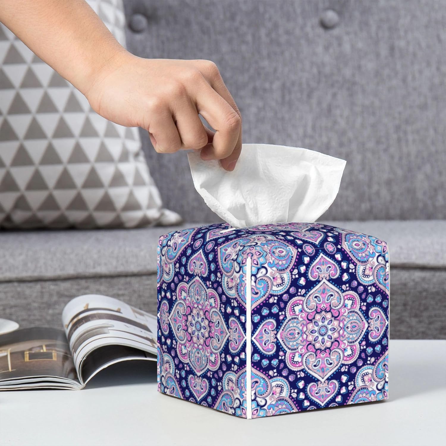 Boho Mandala Flower Tissue Box Cover Square,Indian Paisley Floral Tissue Box Holder Waterproof Leather Facial Paper Organizer Dispenser for Bathroom Home Car Nightstand Vanity Desk