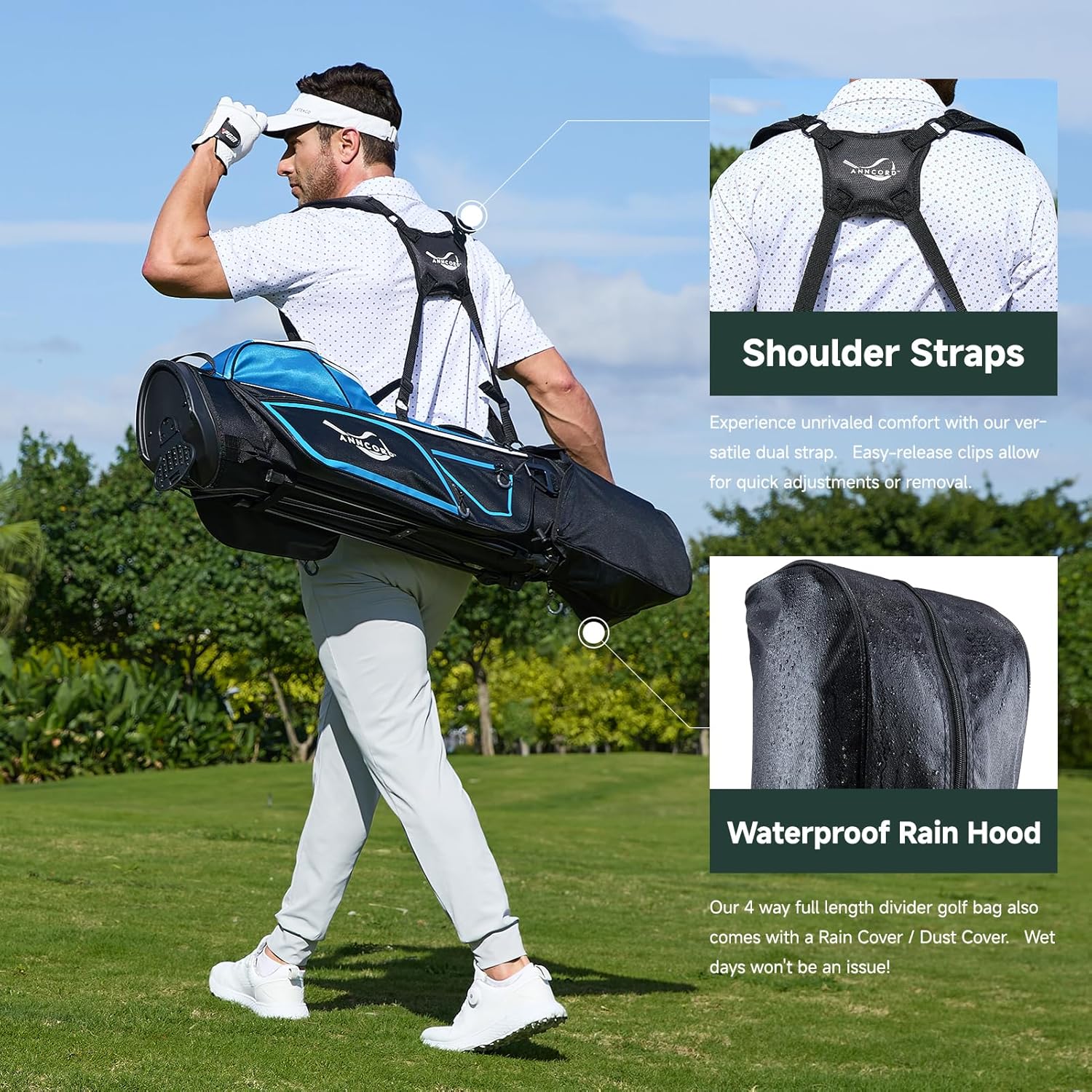 - 【4 Way Full-Length Dividers】Designed for superior organization, the 4-way full-length dividers can accommodate up to 12 golf clubs (max 14)—keeping each club neatly separated and protected from scratching or tangling. The stable stand system ensures excellent balance on any terrain for easy, hassle-free club access.